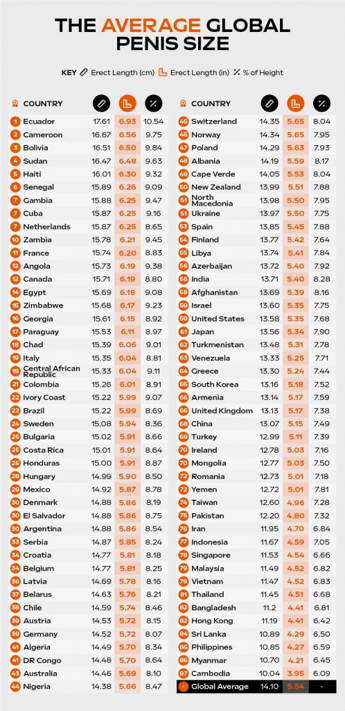 A legnagyobb átlagos péniszmérettel rendelkező országok tízes toplistája: