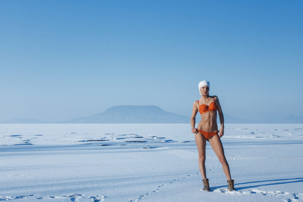 Szerencsére Posza Róbert fantáziája magasabb fordulatszámon pörög, mint a miénk, és kimaxolta a kérésünket: az Alma nevű csinos modellt karonfogva kisétált a befagyott Balatonra Fonyódnál, és már össze is állt a koncepció. Jó, előtte Alma még megszabadult a ruháitól, ami lényeges része volt a tervének.