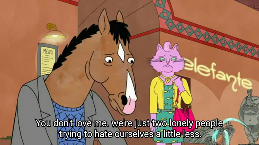 Nagyon nehéz megfogalmazni, miért ilyen fantasztikus ez a cucc: talán azért, mert ebben az elképesztően szürreális világban, ahol egy narcisztikusan önutáló, alkoholista és kiégett félig ló-félig ember a főszereplő, a valóság teljesen jelenvaló a totális abszurd köntösében. Zseniálisak a karakterek, a szövegek, az emberi-állati játszmák, a történetek és kapcsolatok alakulása: bátor, formabontó, őszinte, zsigerileg igazi az egész – az a ritka koktél, mikor az egyik percben szakadsz a röhögéstől (de úgy, hogy tényleg ráz a nevetés és konkrétan vissza kell tekerned, mert lemaradtál két percről a röhögés miatt) majd a másikban beleáll a kés az asztallapba és olyan megrendítően igazi dolgokat kapsz, amiket valós színészek által játszott cuccokban is baromi ritkán.