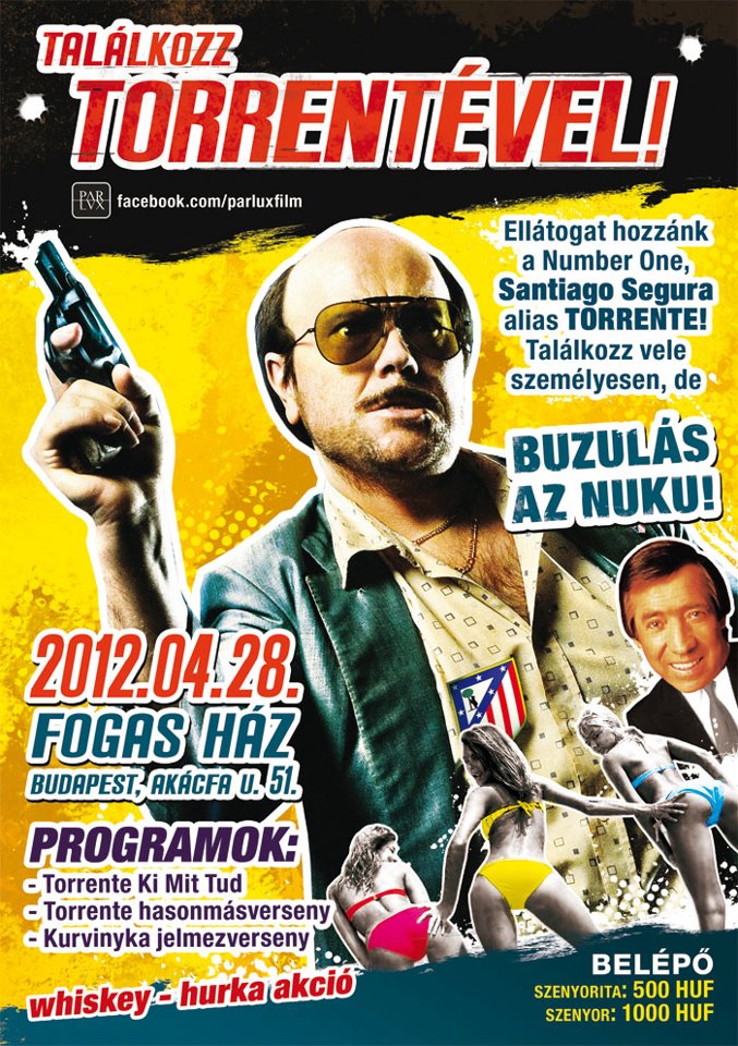 Április 28-án, azaz szombaton jön Santiago Segura, alias Torrente, ráadásul a Fogasházba, ahol mindjárt bulit is rittyentenek hazánkba érkezése örömére. DJ-k, whiskey-hurka akció, közös fotózás, Torrente jelmezverseny, Kurvinyka jelmezverseny, ki mit tud, és nuku buzulás várható. A jelszót tudjátok: fonákkal, kisk*csög, fonákkal! Belépő: szenyoroknak 1000 Ft, szenyoritáknak 500 Ft.