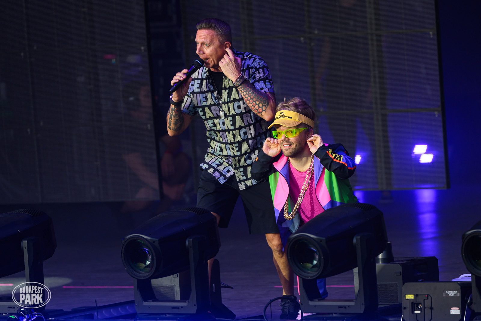 A Budapest Parkhoz érve egészen gyorsan nyilvánvalóvá vált számomra, hogy erre a bulira nem katasztrófaturisták vettek jegyet. A Parkot elárasztó néptömeg meglepően nagy része hozott olyan outfitet, ami határozottan játszott rá a kilencvenes évekbeli hangulatra, sokan pedig büszkén kapták magukra azokat a DJ Otis láthatósági kukásmellényeket, amiket a szervezők osztogattak a bejáratnál. Amikor beértünk, már lement a bemelegítésért felelős Animal Cannibals és éppen Kozso üvöltötte a Szomorú szamurájt, a küzdőteret roskadásig megtöltő bulizók pedig láthatóan már most imádták az egészet.