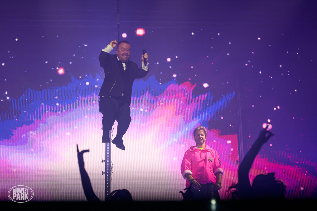 Mérsékelt lelkesedéssel fogadtam a kezdést, de még így is lenyűgözőnek találtam a videós felkonfot, amit a produkció mögött álló csapat gyakorlatilag teljes egészében képalkotó mesterséges intelligencia segítségével hozott össze. Ezek a klipek néhány éve még súlyos pénzekbe kerültek volna, most azonban elég megírni néhány ütős promptot, és máris kész van egy videó, amiben a kigyúrt DJ Oti Brezsnyevvel smárol, Angela Merkellel romantikázik, vagy Freddie Mercuryval pózol a színpadon. Ilyen, és ezekhez hasonló jelenetekkel indított a show, ami elképesztően profi színpadi technikával járt kéz a kézben.