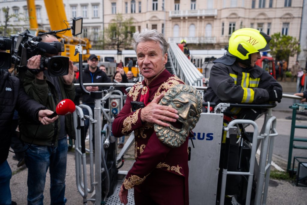 Ifj. Simet László artistaművész a cirkusz világnapja alkalmából egyensúlyozott át Duna felett szombaton.