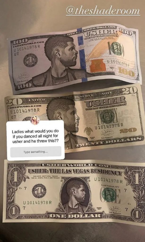 A sztoriban egy kép látható egy egy- egy tíz- és egy százdolláros játékbankóról, melyeken Usher képe látható, Pisces pedig egy szavazásban azt kérdezte a követőitől, hogy ők mit csinálnának, ha egész este táncolnának a rappernek, aki cserébe ilyenekkel akarna fizetni.