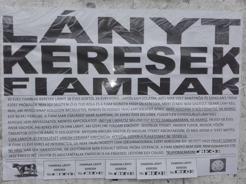 A 444-nek küldte el egy olvasó ezt a kiragasztott hirdetést, melyen egy „modern anyuka” elégelte már meg, hogy a kicsi fiának nincs menyecskéje – és falra ragasztós, letéphetős hirdetéshez folyamodott. Így, ahogy van, tökéletes, nem tudunk mit hozzátenni, de meg kellett osztanunk.