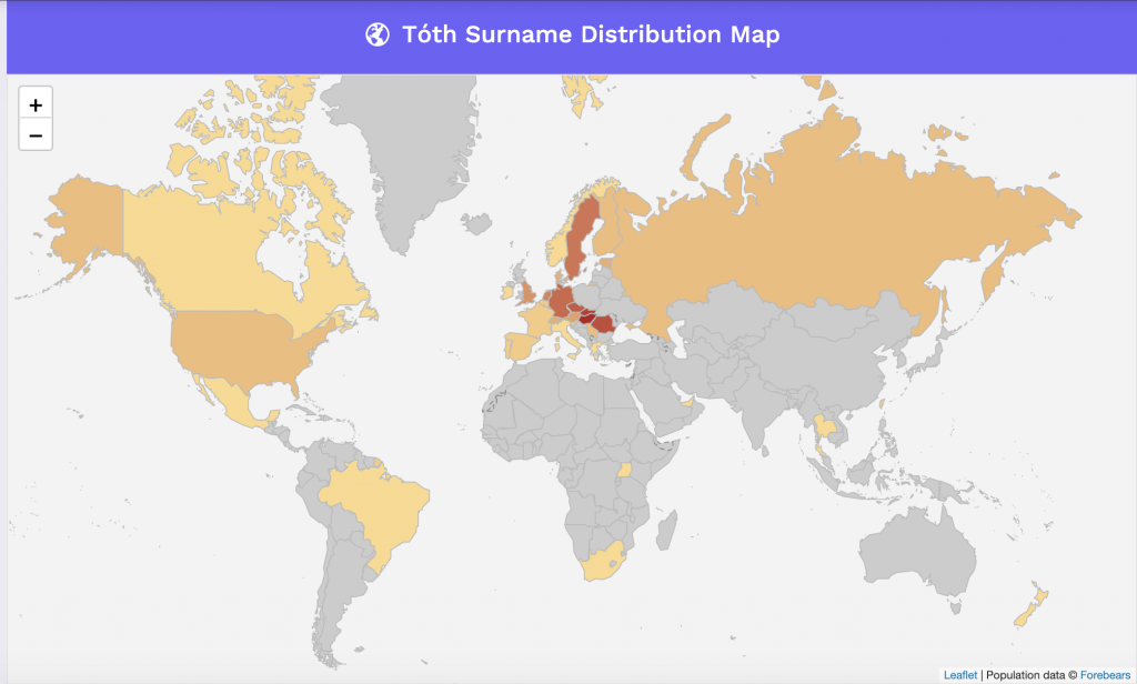 Aztán valami ilyesmit fog kidobni – mi a Tóthra kerestünk rá, amit kábé 313 568 ember visel a Földön, ami így a 1774. legnépszerűbb vezetéknév. Egy térképen meg is nézheted, hol a legelterjedtebb: