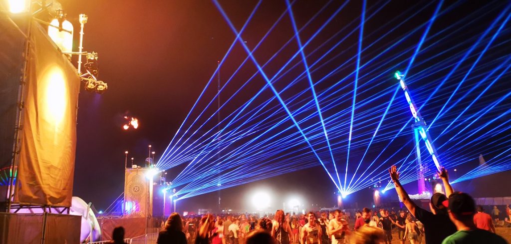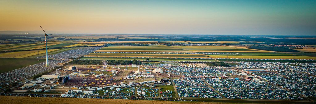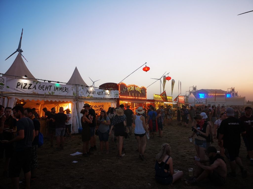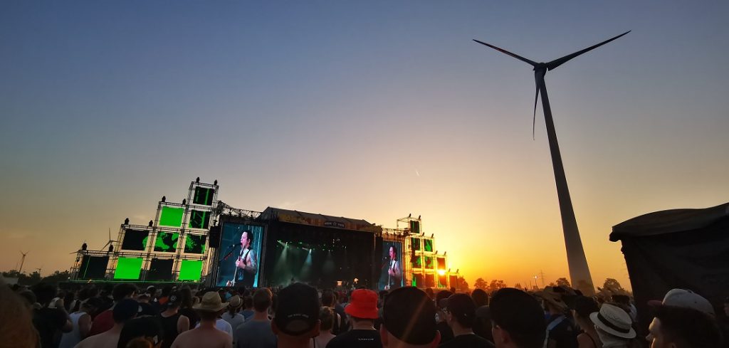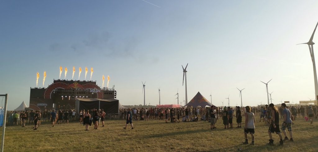 Egyébként a tűz az egész fesztiválon ott figyel. Nappal nem különösebben látványos a helyszín, éjszaka viszont kivirágzik, minden neonfényes, jönnek a lézerek, a lángcsóvák, szóval gyönyörű, na. És az sem mellékes, hogy a fesztivált körülvevő szélerőmű-extravaganza is csodaszép, főleg a lemenő nap fényében.