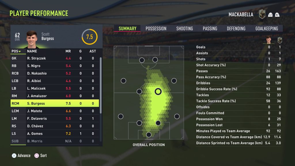 A szerelések, labdaszerzések idén sem javultak, néha teljesen a FIFA-isteneken múlik, hogy hányszor kell tisztán szerelnünk, hogy végül meg is szerezzük a labdát. Lábakon, mellkasokon és egyéb testrészeken áthaladó labdákkal azonban még nem találkoztam, de lehet, hogy nem játszottam eleget. A meccsvégi animációk viszont teljesen megújultak, rengeteg eddig nem látott statisztikai mutató jelent meg, ilyen az xG, a passzaink száma, típusa vagy a játékosok hőtérképe.