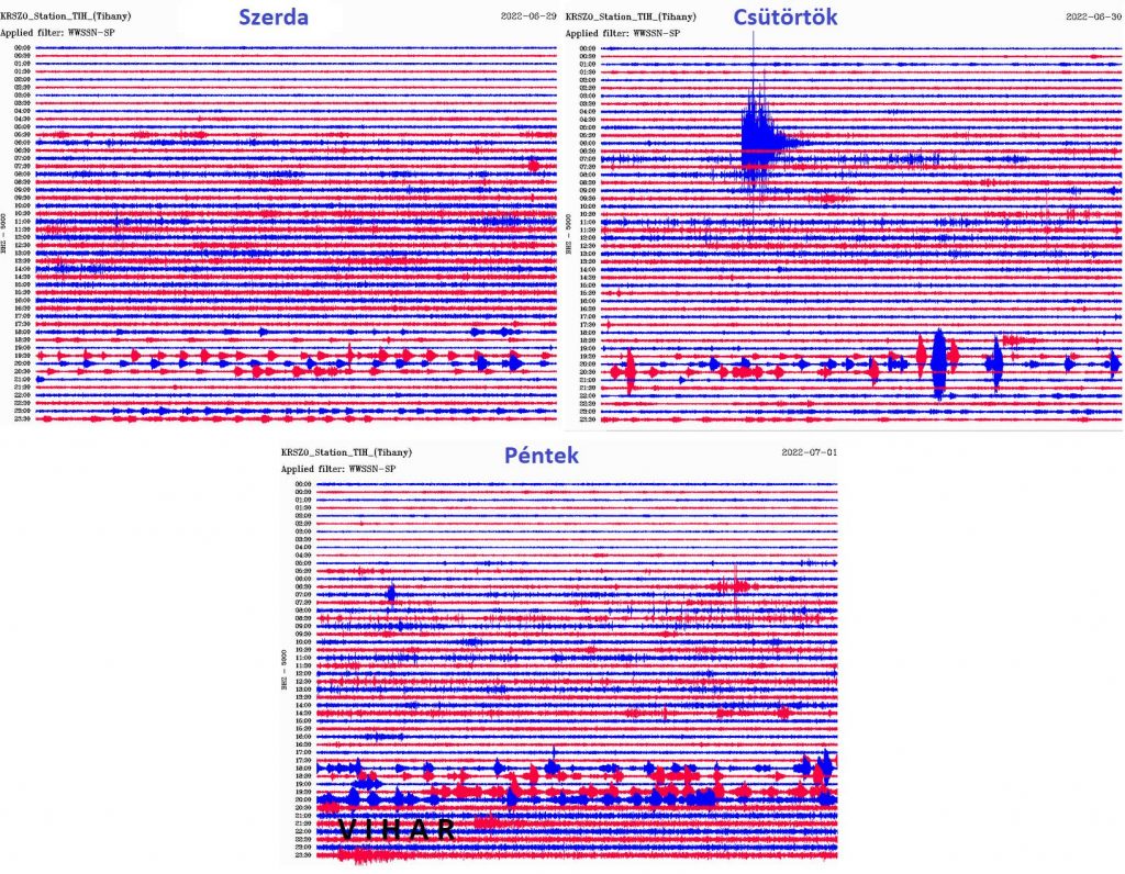 A szeizmográffelvételek jól mutatják, hogy csütörtökön hatalmasat tomboltak fesztiválozók, ahogy pénteken a vihar is, aminek rezgései is kivehetők