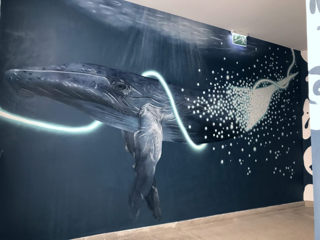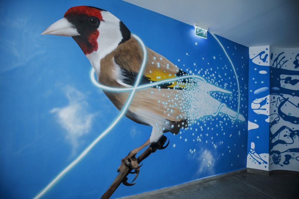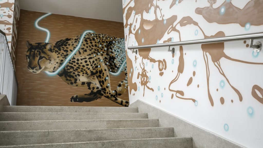 A négy festmény az első emeleti lépcsőfordulótól egészen a negyedikig egy-egy külön világba hívja az arra járókat. A lépcsőház négy szintje a tengerek mélyétől (cet) a szárazföldön (gepárd) át egészen az égig (tengelic) vezeti a szemlélőt, a legfelső emeleten pedig a családot és a digitalizáció fonalát kezében tartó embert láthatjuk.