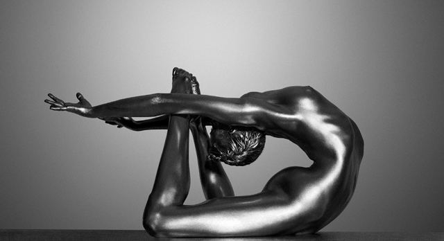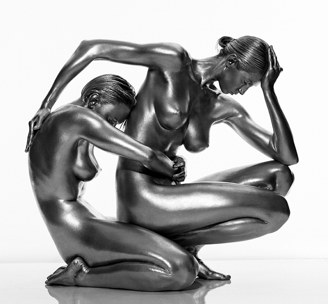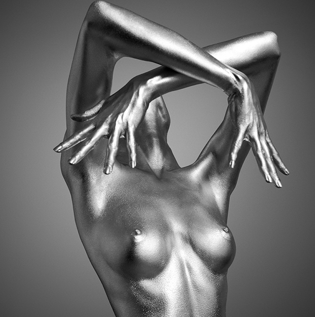 Guido Argentini olasz fotós leginkább női portréiról híresült el. Most sem nyúlt máshoz, mint a női testhez, a meztelen, ezüst festékkel bekent női testhez.
