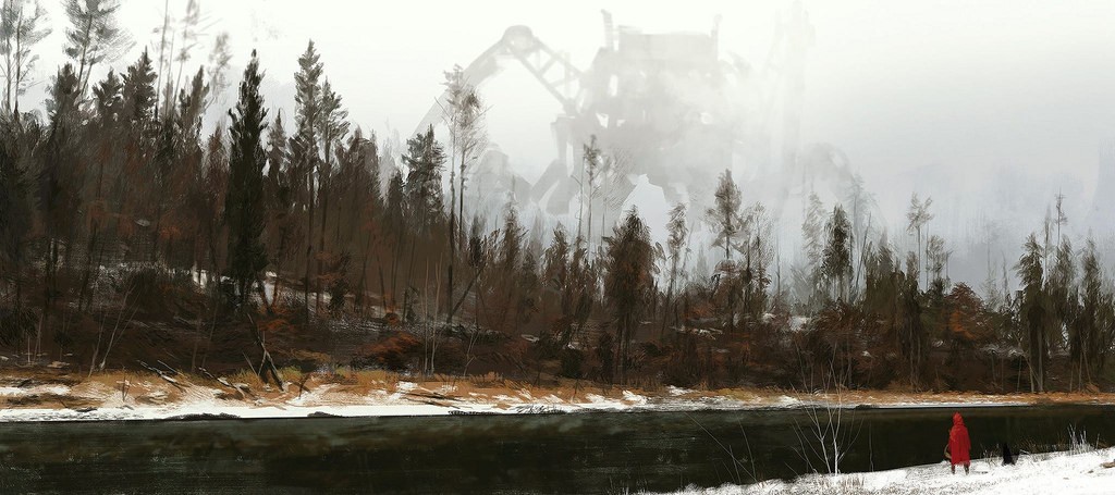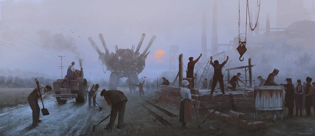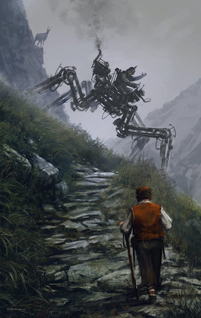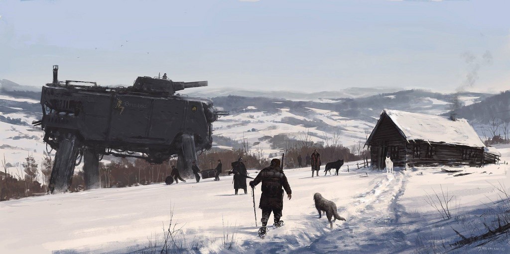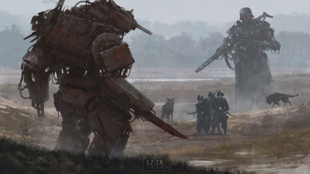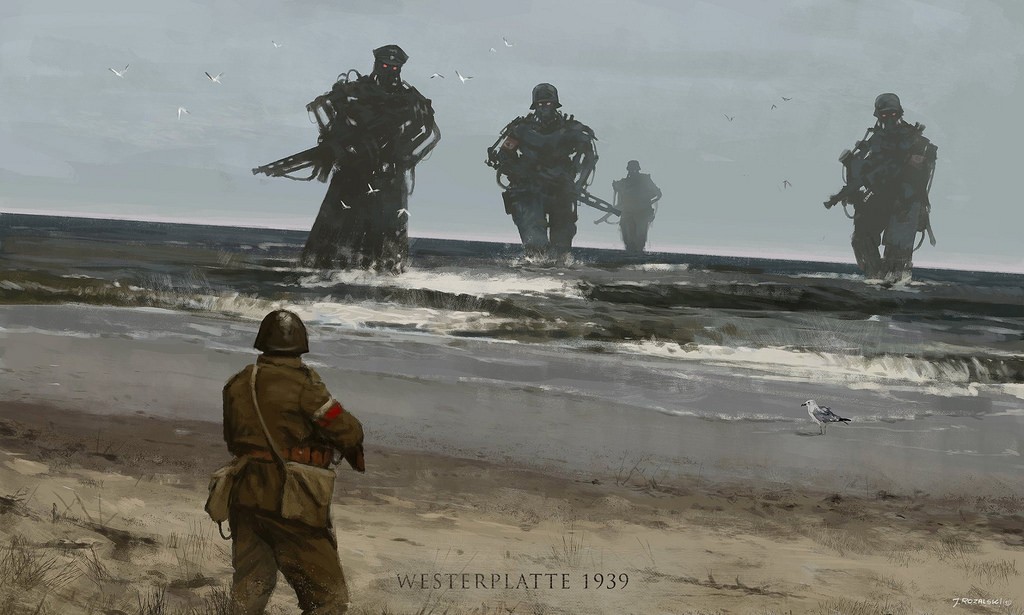 Jakub Rozalski, lengyel festőművész elképesztő képeket alkotott egy alternatív univerzumról, melyben a múlt század elején-közepén hatalmas steampunk gépszörnyek szaggatják föl Kelet-Európát. Önkényuralmi jelképet ugyan csak elvétve látunk, de így is egyértelmű a párhuzam. Félelmetes és lenyűgöző alkotások.