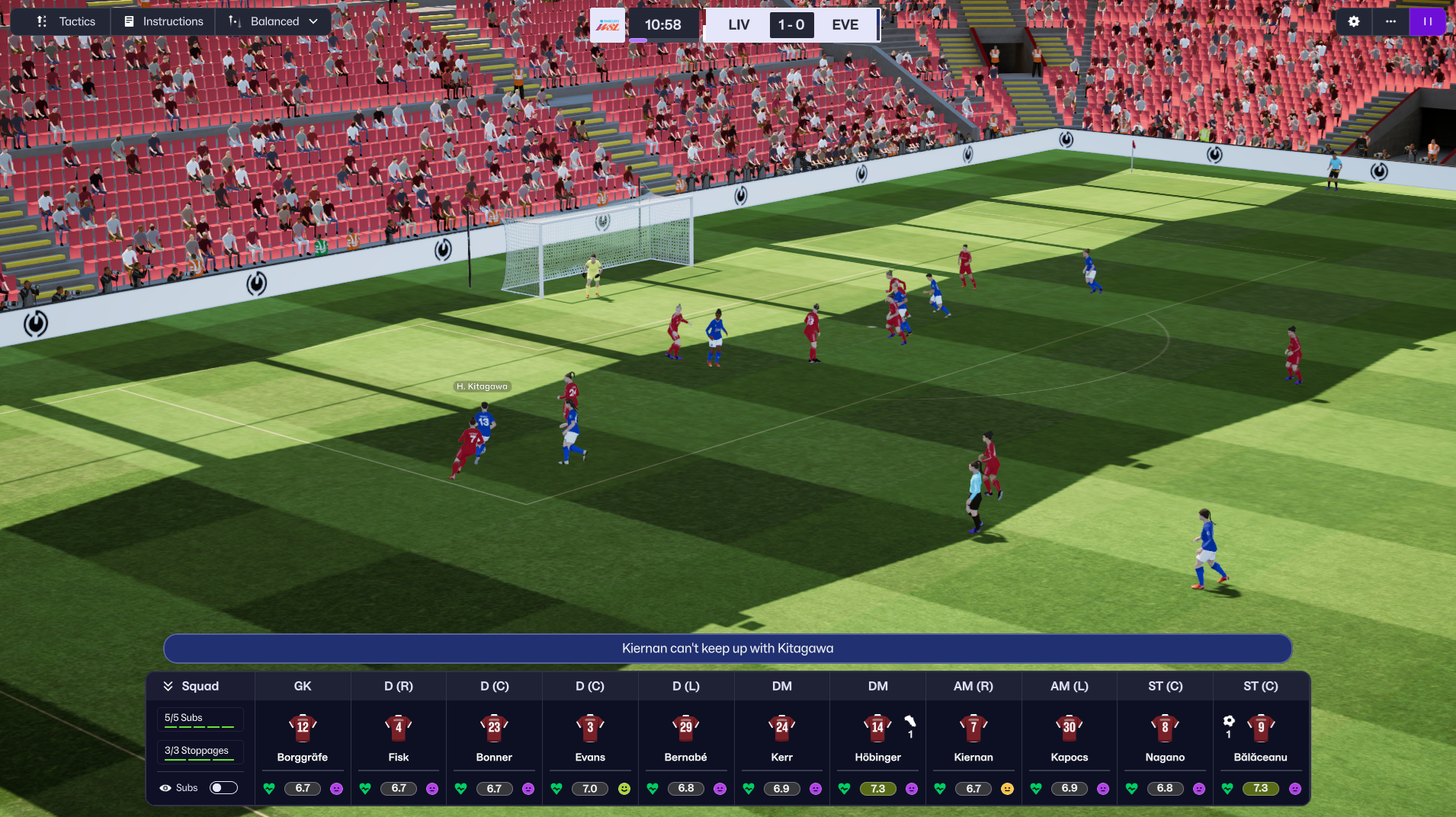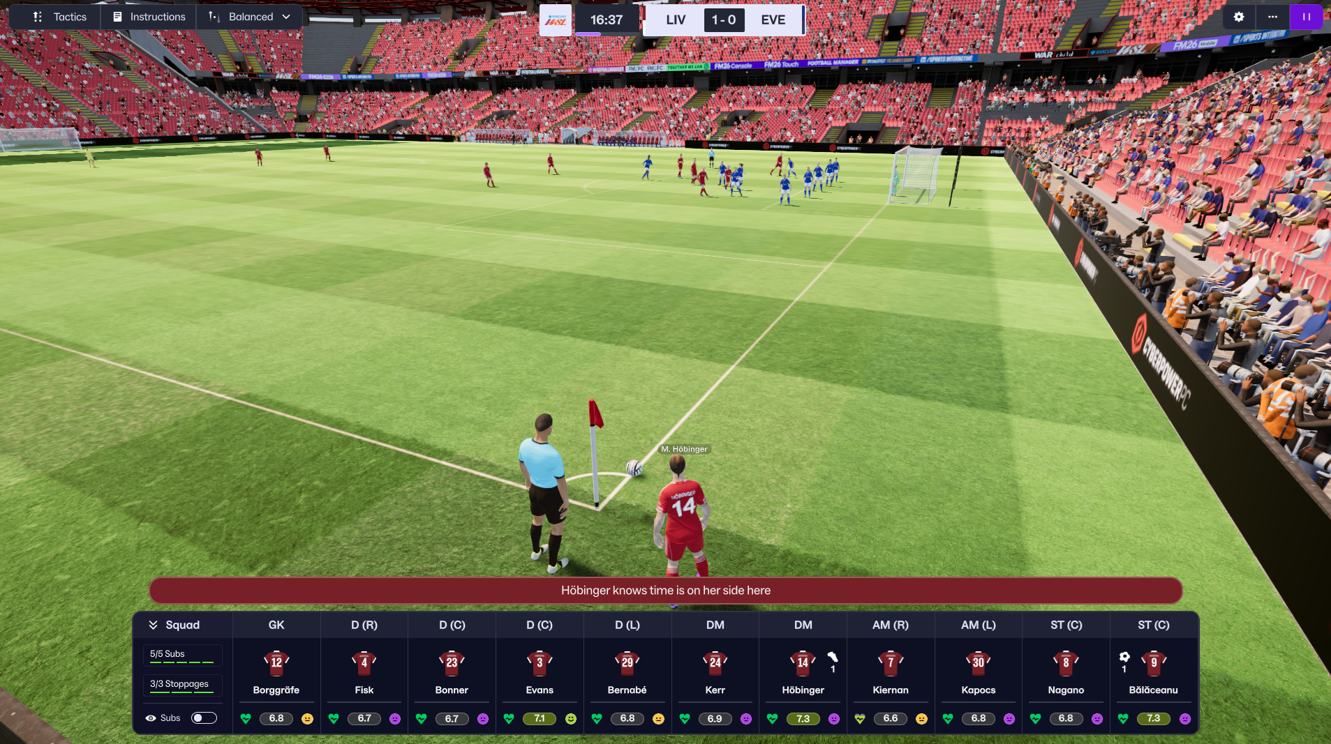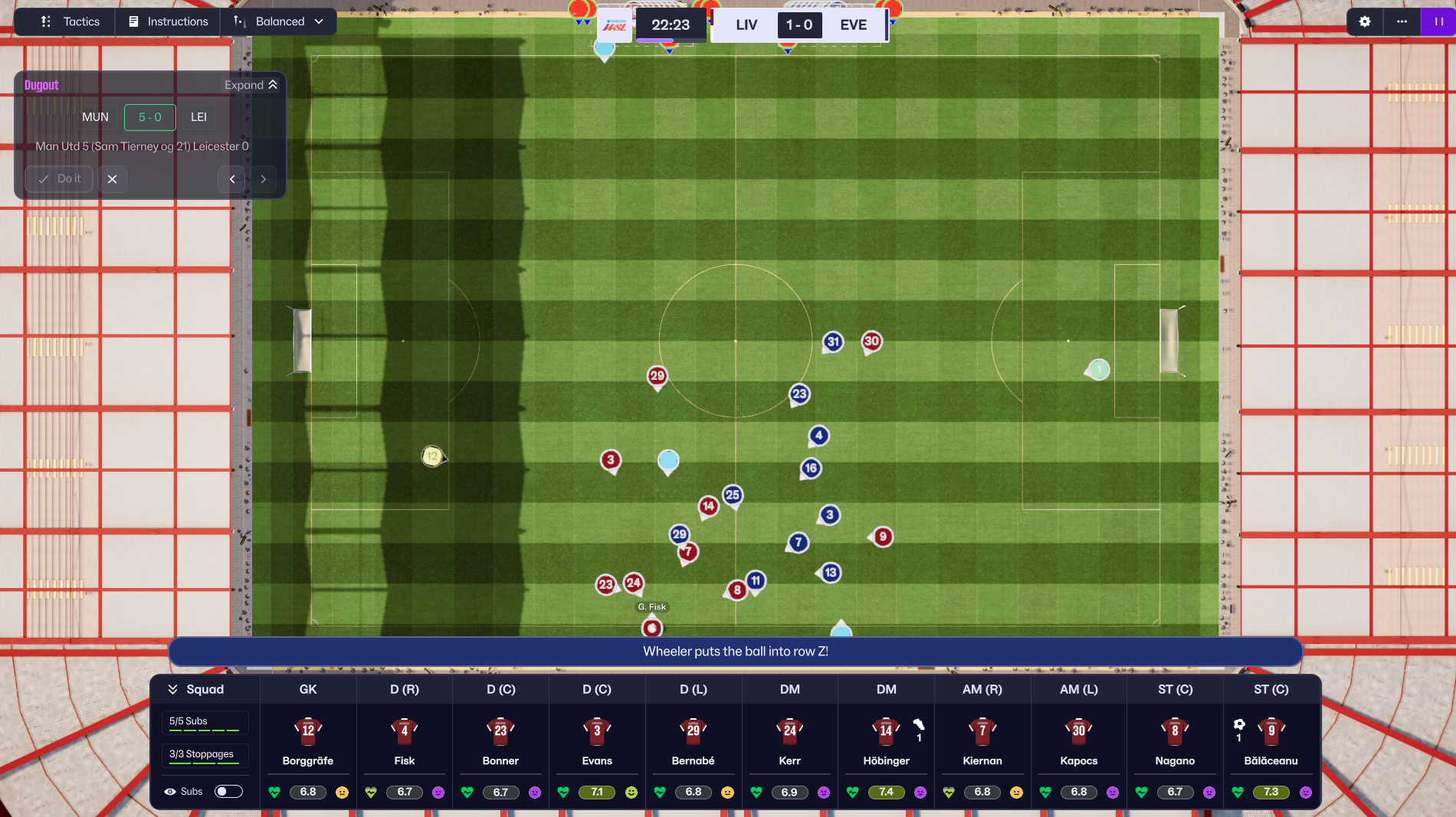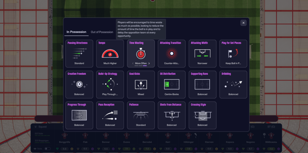- Meccs közben az Instructions résznél egyszerűbben, átláthatóbban tudunk friss taktikai utasítást adni. Csak néhány kattintással, jól vizualizált módon tudunk változtatni azon, hogy milyen legyen a passzjátékunk, mennyire húzzuk az időt, mennyire szélesen játszunk, milyen legyen a labdakihozatal, és így tovább.