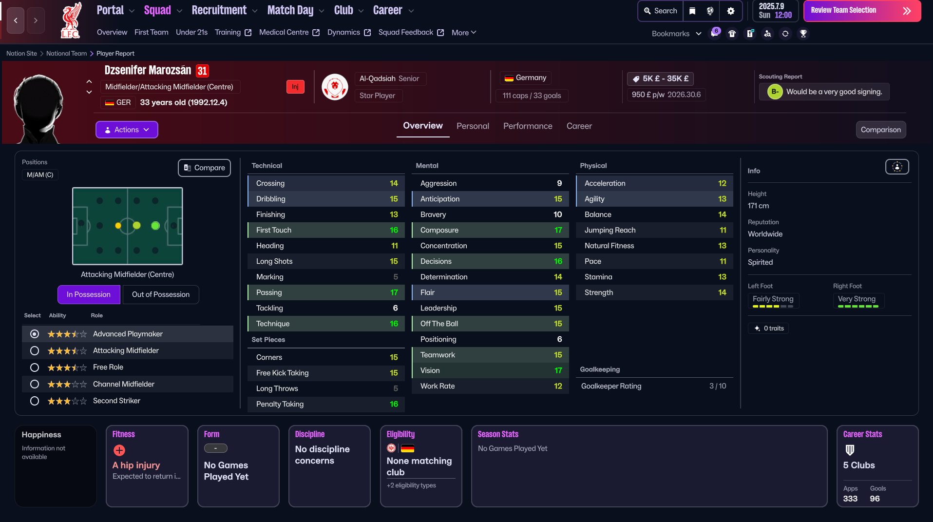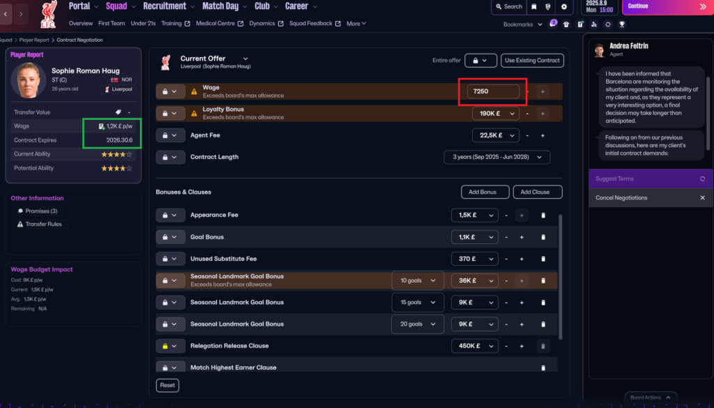 Persze azért ne gondoljuk azt, hogy az élet itt egy idő után papsajt: ha nem állunk jól anyagilag és sportszakmailag, a penge játékosokat ugyanúgy nem fogjuk tudni elcsábítani, egyszerűen kikosaraznak minket, vagy olyan fizetéseket kérnek majd, amelyek egyszerűen teljesíthetetlenek a mi szintünkön, még akkor is, ha mondjuk az angol elsőosztályú Liverpoolt menedzseljük. A női Liverpool helyzete nem épp kényelmes az angol ligában, az utolsók közé jósolják őket, néhány éve pedig ki is estek. Az ugyanakkor megdöbbentett, hogy év végén tucatnyi játékosomnak is lejár a szerződése, méghozzá a legjobbaknak... a legnagyobb sztárom pedig, a norvég Sophie Roman Haug pedig az 1,2 ezer fontos heti fizetés helyett 7,8 ezret kér... hatszoros fizetésemelést! Haha!