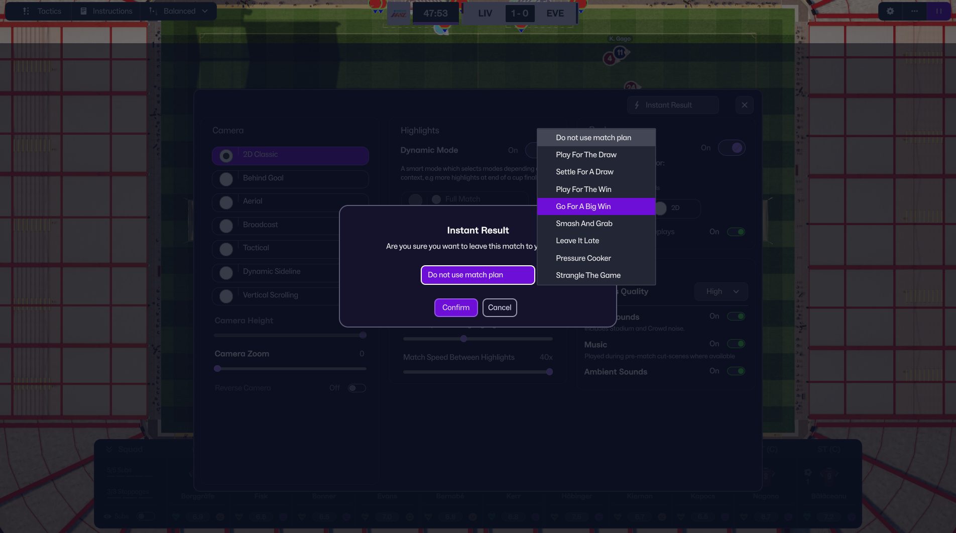 Mindenképp kiemelném azt, hogy most már az Instant Result menüpont révén azonnal le lehet szimulálni azokat a meccseket, amelyeket nem akarunk lejátszani, vagy már nem akarunk folytatni. Ezt mérkőzés előtt és közben is megtehetjük – régen csak az a lehetőség volt a kezünkben, ha szabadságra mentünk. Most már viszont ha nagyon rosszul alakul egy meccs, és nem akarjuk végigszenvedni, vagy épp gyorsan le kell zárnunk a játékot, mert a kedves párunk hamarabb hazajött munkából, és nem akarjuk, hogy elkapjon minket zsuga közben, nos, néhány kattintás alatt a játék le is generálja az eredményt. Ez a megoldás egyébként a FIFA-ban... vagyis az EA FC-ben jó ideje jelen van, igaz, ott nem volt lehetőségünk arra, hogy eredménygenerálás során döntetlenre, vereség elkerülésére, győzelemre, kiütéses győzelemre törekedjünk.