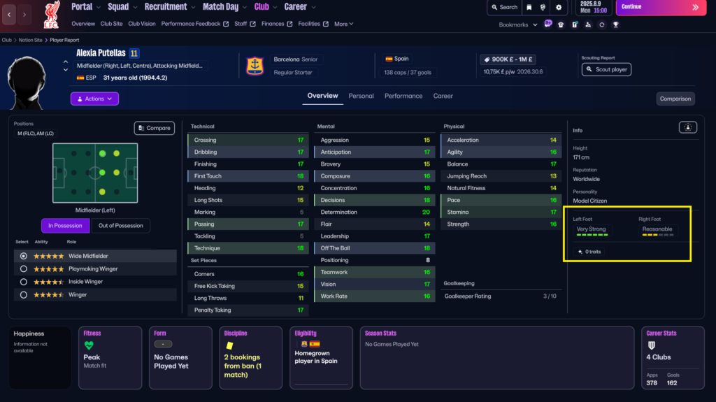 - Ahogyan most már arról is képet kaphatunk az EA FC-hez hasonlóan, hogy egy játékosnak mennyire erős a bal és a jobb lába, régebben csak utalás volt rá. Mindkét láb esetében egy 1-től 6-ig terjedő skálát láthatunk, ennek az abszolút királya Ousmane Dembélé, akinek mindkét lába maximális hatost ér, és aki igazából se tudja, hogy melyik lábával rúg legszívesebben labdába, annyira jó mindkettővel. A kétszeres Alexia Putellas viszont eléggé ballábas, a jobb lábát csak 3-asra értékelte a játék.
