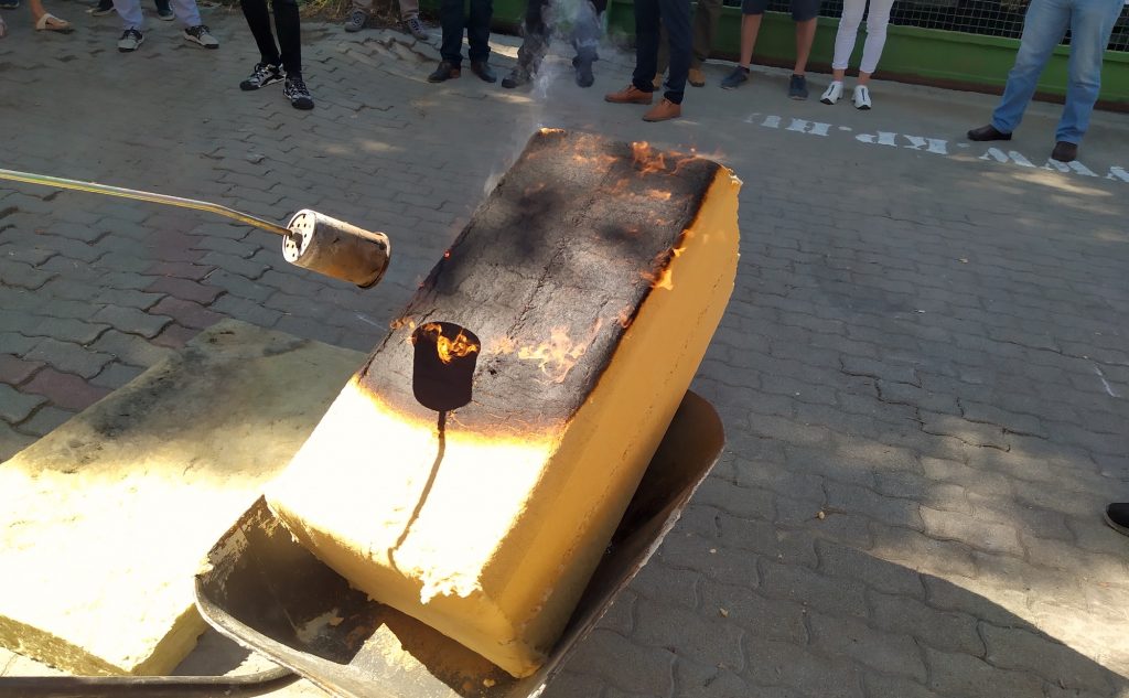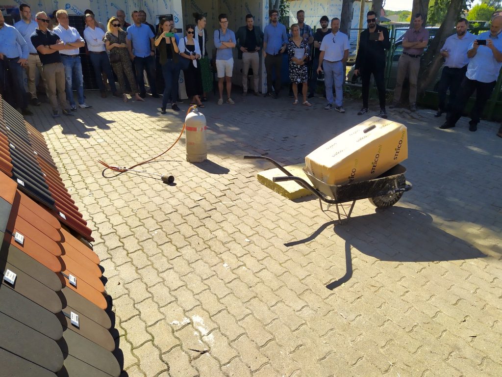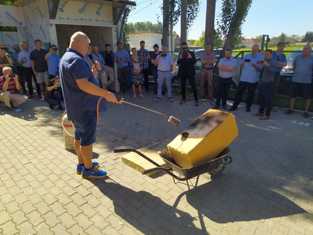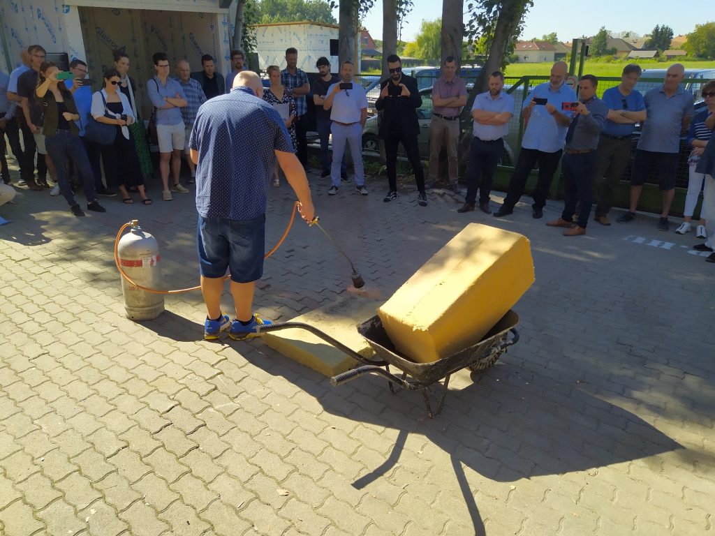 Elégetdetten konstatáltuk, hogy az anyag ellenáll a lángoknak: az adott típus tűzállósága kilencven perc, nem mellesleg egy Magyarországon is kapható, német szabványba sorolt építőanyagról van szó, amelynek E osztályú a tűzállósága a helyi besorolás szerint.