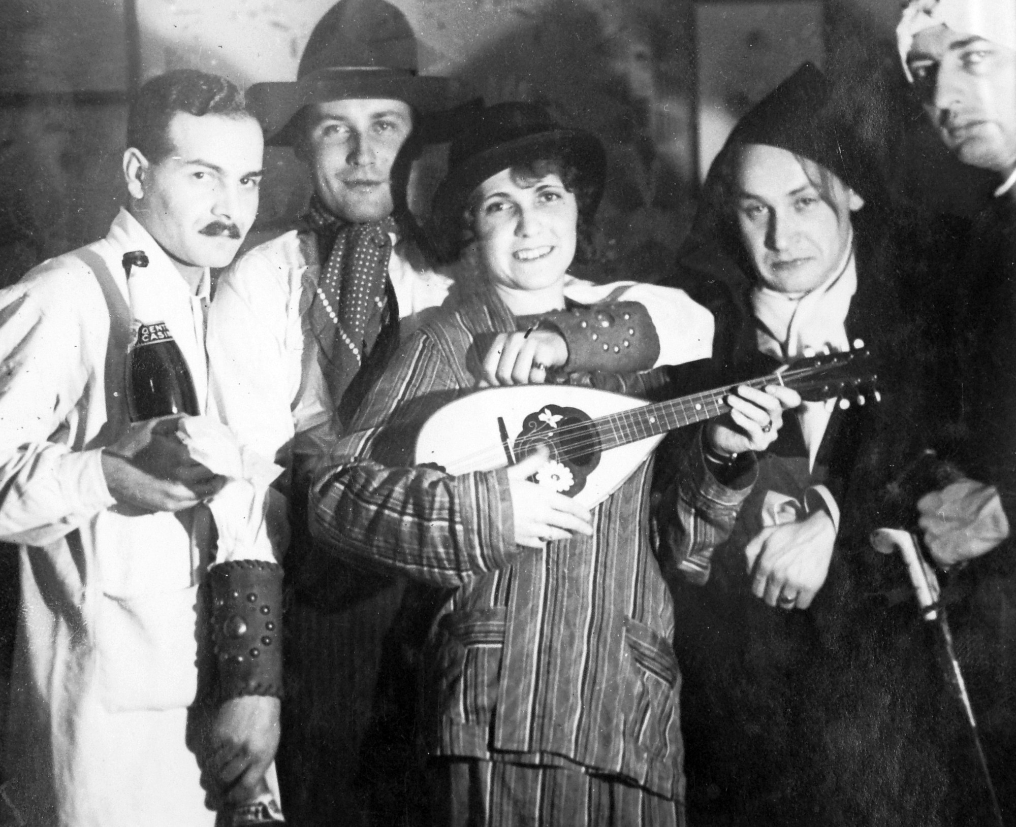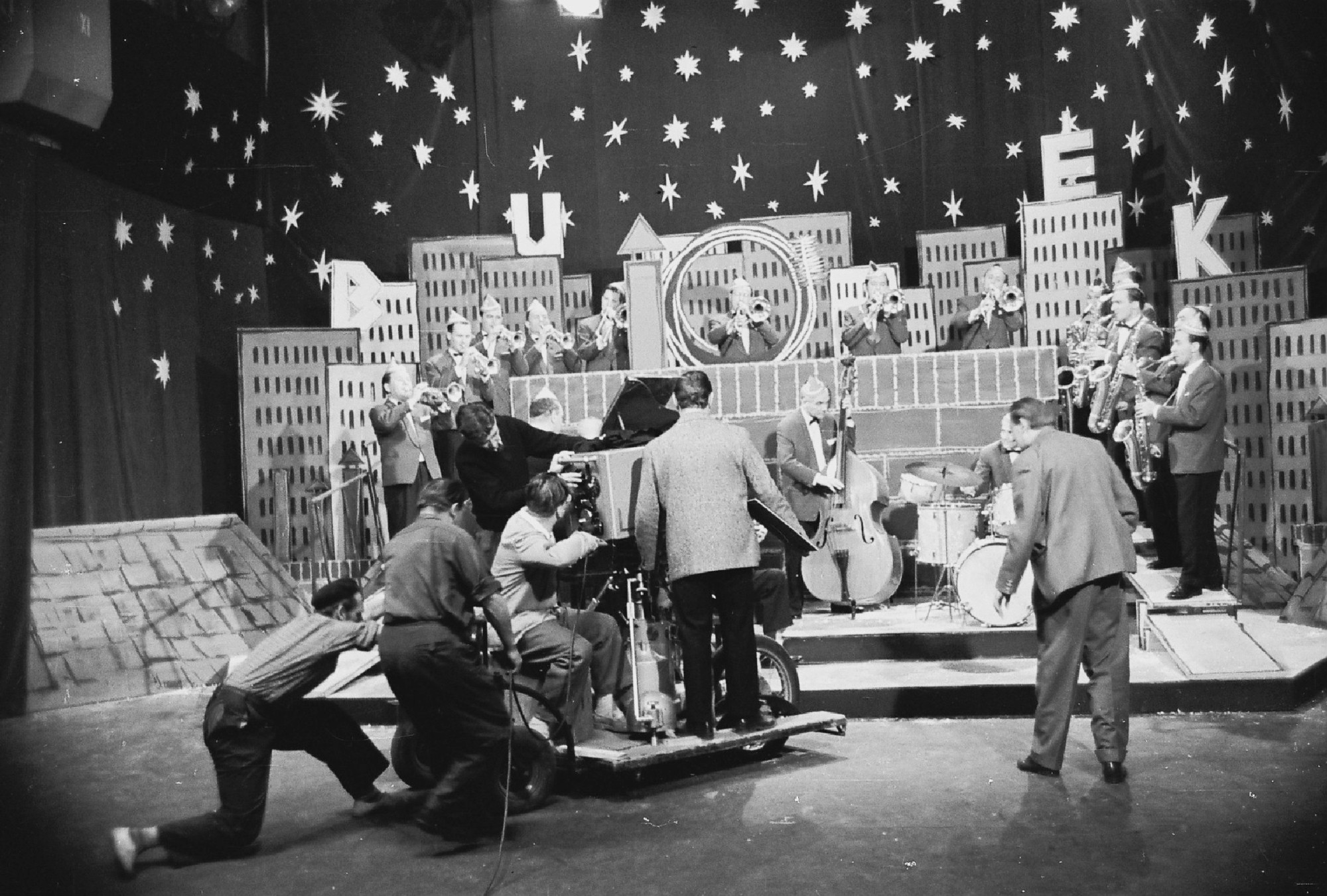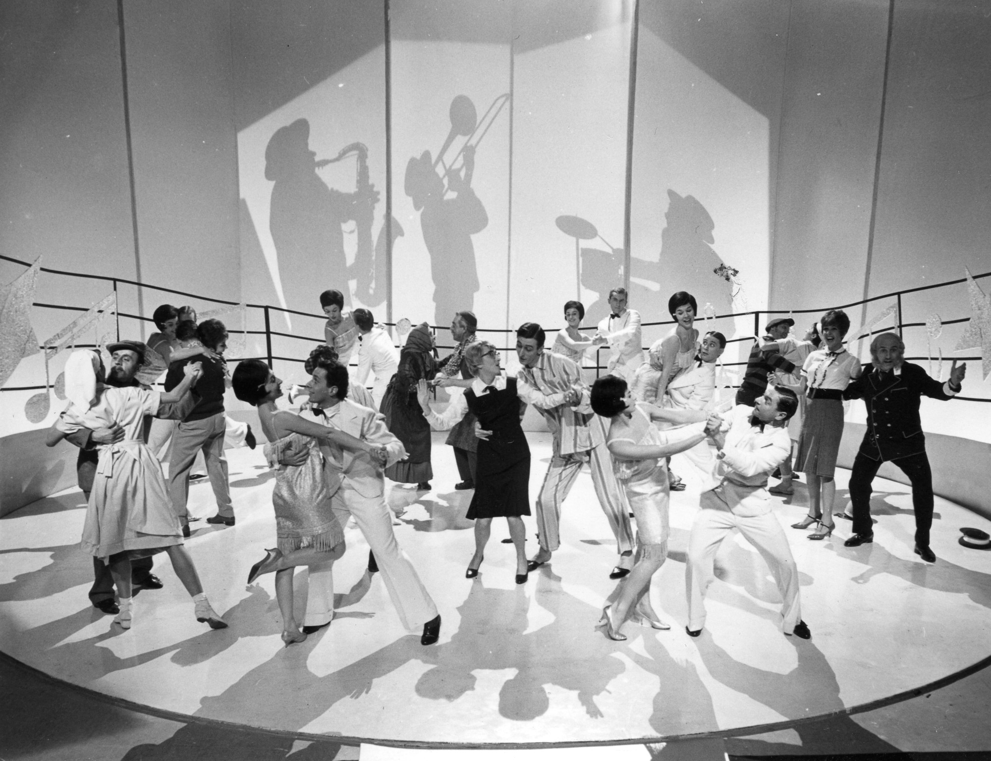 Jelenet az MTV 1963. szilveszteri műsorában sugárzott, Slágermúzeum című revüfilmből. Balra, háttal, sötét pulóverben Bodrogi Gyula, vele táncol Lehoczky Zsuzsa, a jobb szélen Psota Irén és Alfonzó (Markos József) színművészek (Forrás: Fortepan/Hangosfilm)