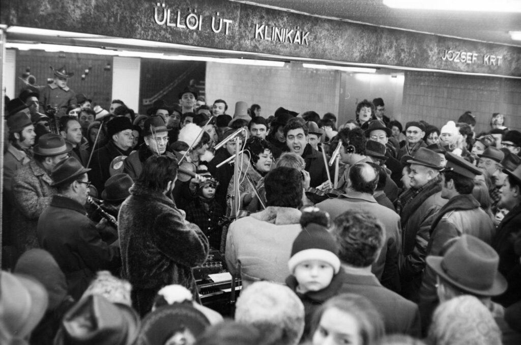 A szilveszteri kívánságműsor közvetítése „Térzene” az Üllői úti aluljáróban címmel, 1971-ben, az Üllői út–Nagykörút kereszteződés aluljárójában. Középen Kovács Apollónia és Bojtor Imre népdalénekesek, fejhallgatóval Szilágyi János riporter (Forrás: Fortepan/Szalay Zoltán)