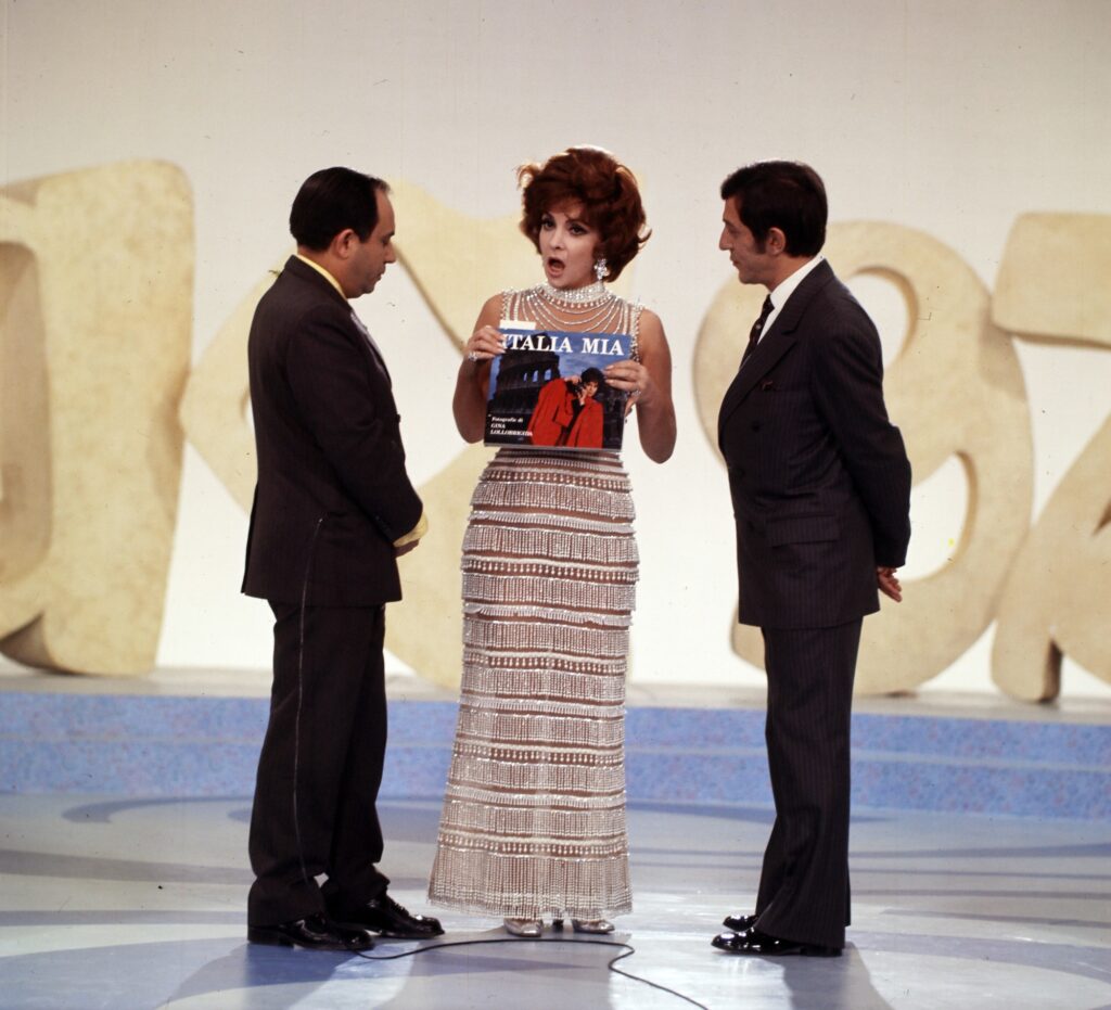 Szupersztárok a Magyar Televízióban, az 1972-es szilveszteri műsorban: Vitray Tamás, Gina Lollobrigida és Antal Imre (Forrás: Fortepan/Szalay Zoltán)