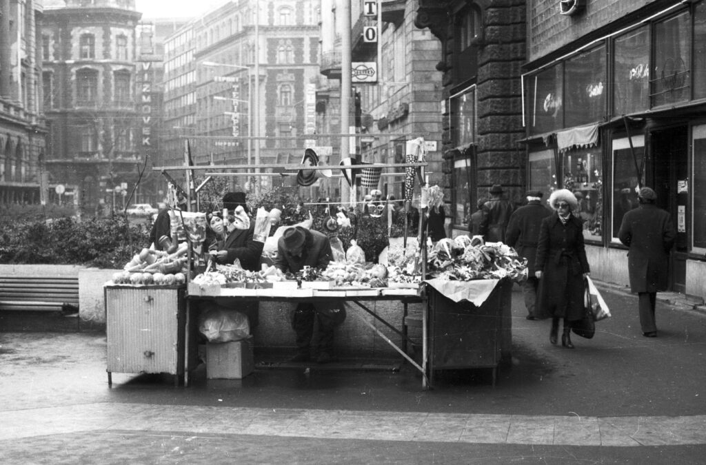 Árus 1977-ben. A háttérben az azóta megszüntetett autós aluljáró lejárata a Ferenciek terén (Forrás: Fortepan)