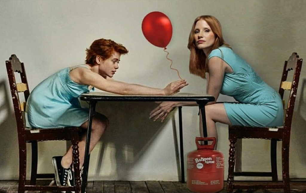 A bal oldalon a gyermek Beverlyt alakító Sophia Lillis látható, amint átpasszolja az ikonikus piros lufit felnőttkori önmagának.