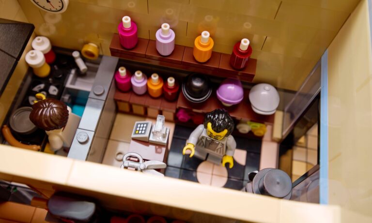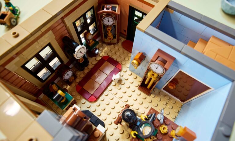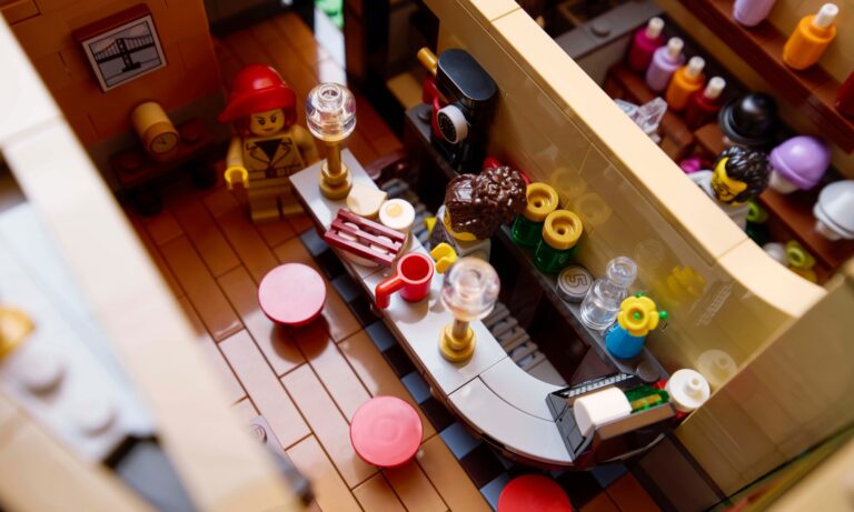 Mivel két oldalról is járda keretezi, ezért egészen kompakt az épület, de így is bőven fértek izgalmas megoldások a Tudor Cornerbe. A 3266 darabos készlet alsó szintjén egy kávézó és egy kalapbolt van, az emeleteken pedig órás műhely és egy lakás található, de a lépcsősor alatt ott az elmaradhatatlan klotyó is. Minden szint könnyedén leemelhető, így ezek a klassz részletekkel telepakolt kis terek összeépítés után is láthatóak.