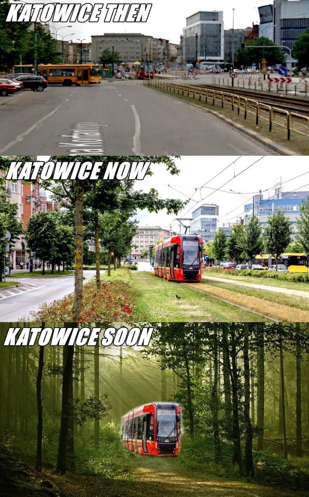Szóval korábban autók, szürkeség, pöfögés, most béke, zöld, gyalogosok. Ez az alapképlet, amit viszont a lengyelek szimpatikus iróniával túlhúztak egy mém erejéig: