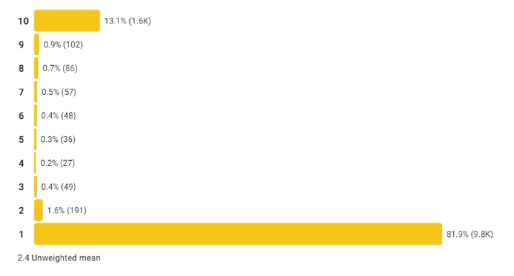 A cikk írásának pillanatában 1600 felhasználó dobott tíz, 9800 felhasználó pedig egy csillagot a filmre, és azt még az elfogultak is beláthatják, hogy egyik szélső pontszám sem reprezentálja megfelelően a mozi minőségét. Ha a szavazatokat leszűrjük a magyar IP-címekről érkezettekre, az összkép még egy kicsit rosszabb, hiszen a magyarországi szavazók pontszámai alapján a film jelenleg 1,4-en áll.