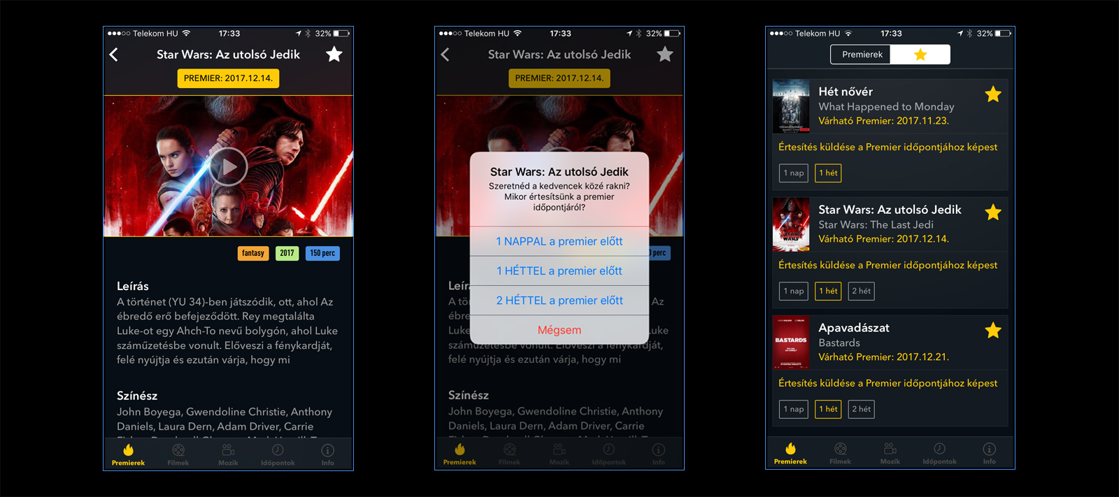 Itt megtaláljuk a legfrissebb filmeket (épp premierjük hetében lévő filmek), illetve láthatjuk, hogy milyen művek érkeznek az elkövetkező hetekben. A filmprofilra kattintva láthatjuk a bemutató napját, a film trailerét, plakátját (ehhez szét kell húznunk játékosan a képet), leírását és szereplőit. Ha ezek alapján szimpatikus az érkező film, a jobb felső sarokban lévő csillaggal a kedvencekhez tudjuk adni, és saját megnézendő listát készíthetünk.