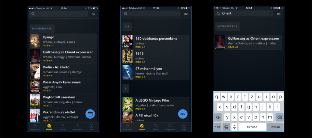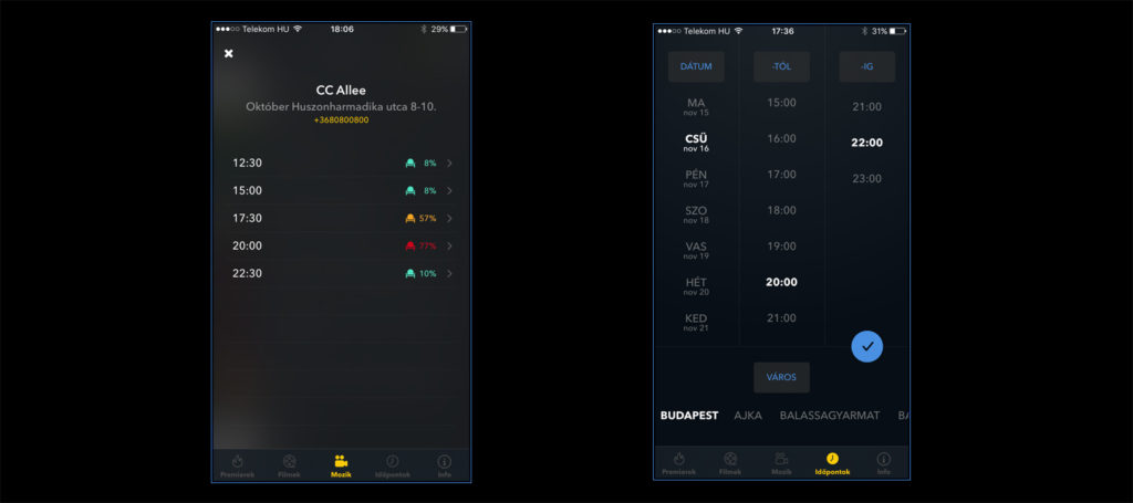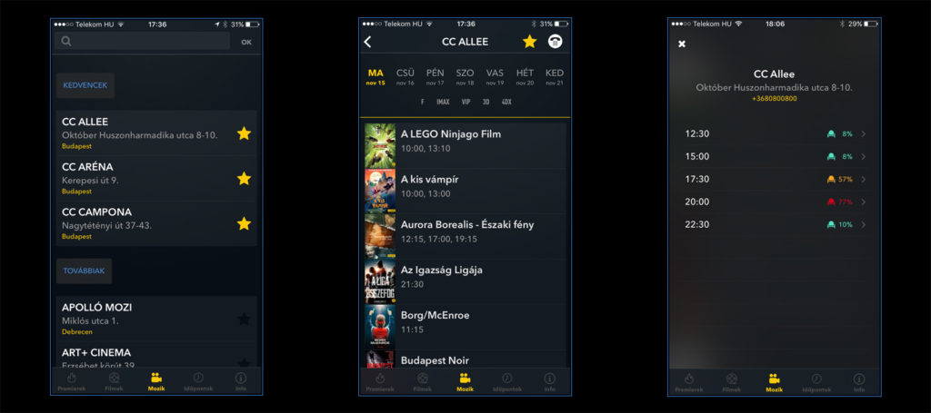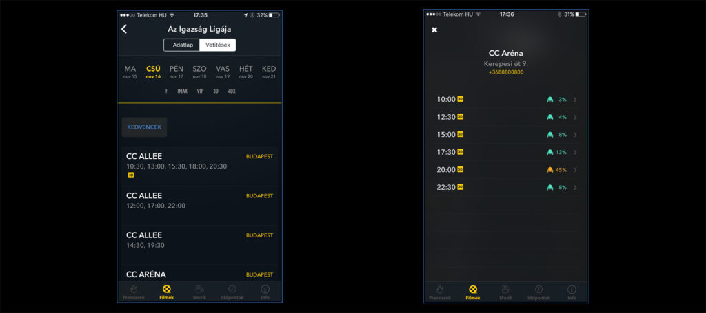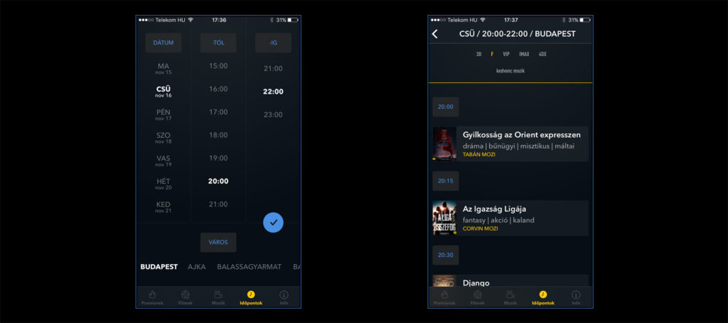 - Az időpontok funkció nagyon hasznos és jól filterezhető: városokra, kedvenc mozikra és további tulajdonságokra (feliratos, 3D, stb...) szűrhető a lista, így egy teljesen személyre szabott moziműsorunk lehet.