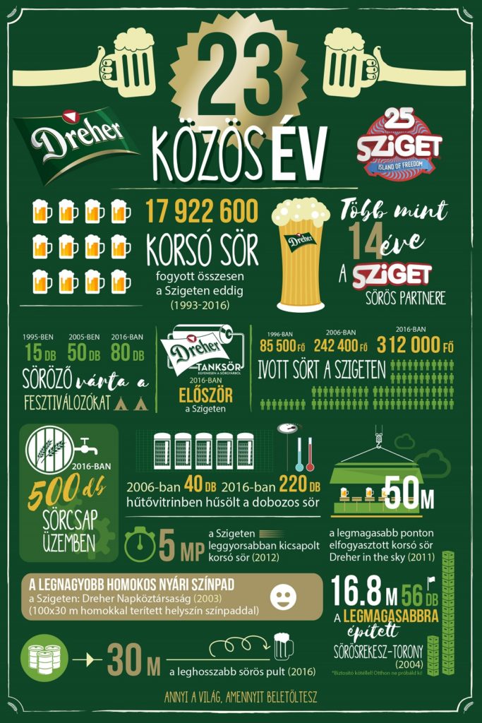 A Sziget és a Dreher már annyira összenőttek, hogy 23 évnyi együttműködés után logikus lépésnek gondolták egy saját Dreher Sziget sört is bevezetését a fesztiválon. Amúgy valóban logikus lépés volt, ha már összesen több mint 18 millió korsóval ittunk meg a sörükből az elmúlt 23 év alatt a Szigeten, ami egyrészt ijesztő szám, másrészt bármennyire is ijesztő, ezt a számot idén bőven meg fogjuk emelni, ha rajtunk múlik. Szóval itt a Sziget Sör. Mehet a konfetti! A sörgyár sörmestere Becz Gábor elmondta, hogy az új termék hidegkomlózásos technológiával, Centennial komlóval készült, amit előszeretettel használnak IPA sörökhöz is. Nemsokára igyekszünk letesztelni, hogy milyen színpadokkal a legkompatibilisebb a Sziget Sör, de nyilván élesben lesz majd a legjobb letesztelni augusztus 9-16. között a Hajógyárin. A Dreher készített egy infografikát is az elmúlt 23 évről, érdemes vetni rá egy pillantást.