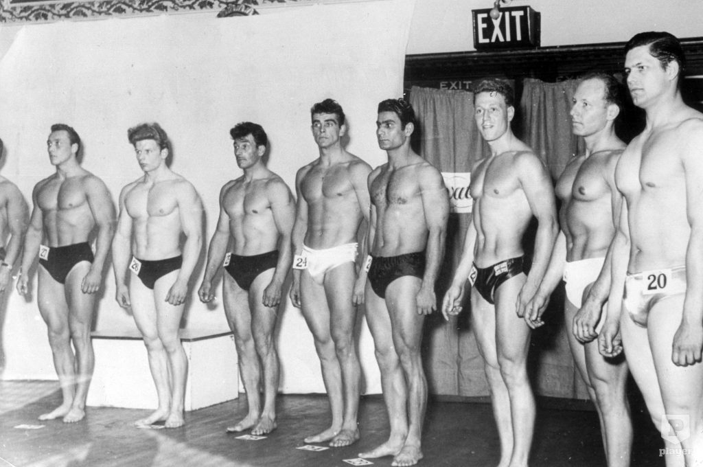 A fiatal korában testépítéssel is foglalkozó Sean Connery középen, 24-es számmal egy németországi férfiszépségversenyen 1950-ben