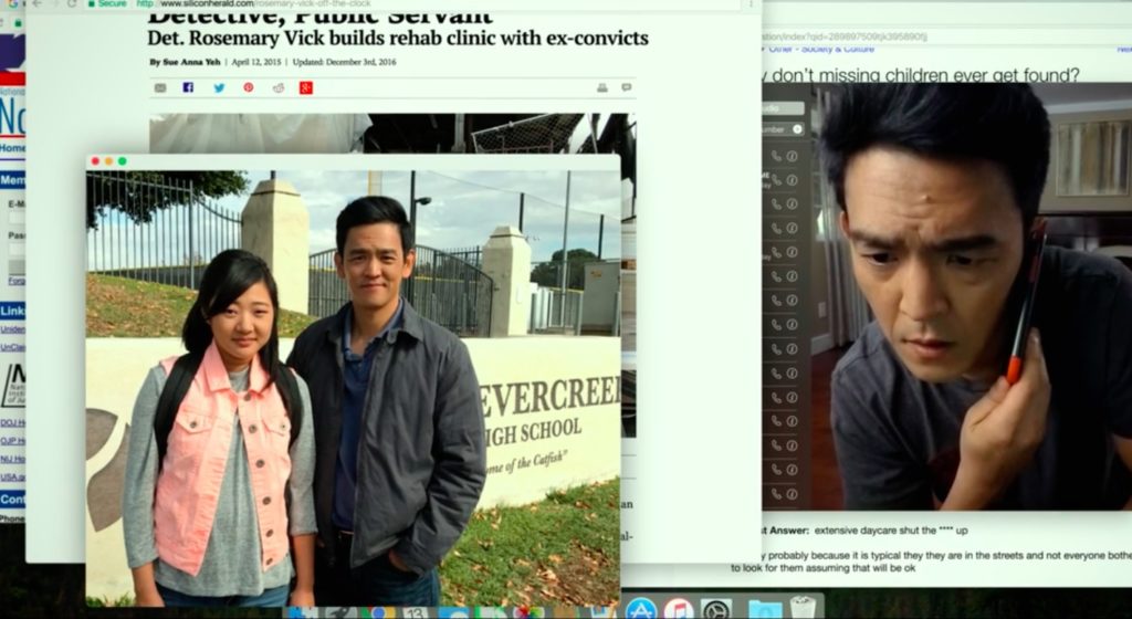 Hát mi ez, ha nem stílusbravúr? Ilyet csak az igazán nagy filmek tudnak, a Keresés pedig lazán kirázta a kisujjából. A történet egy nyomozásról szól, egy apuka, David (John Cho) egyik reggel arra ébred, hogy a lánya, Margot (Michelle La) nem tért haza éjszaka, és aggasztó jeleket kezd felfedezni, amik arra utalnak, hogy valami nagyobb baj történt annál, mint hogy esetleg túlbulikázta magát, és a barátnőjénél alszik. Az is elég aggasztó jel például, hogy több nap után sem jön haza. David aztán keresgélni kezd a lánya laptopján és közösségi oldalain, majd meglepő dolgokra bukkan. Margot eltűnésével egy lelkes nyomozónő, Rosemary Vick is elkezd foglalkozni, aztán egyik fordulat jön a másik után.