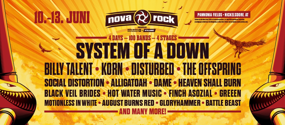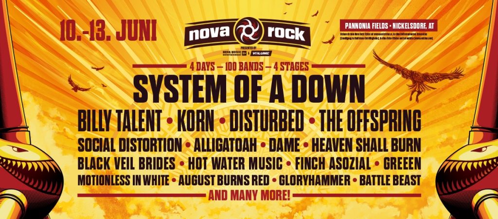 A Nova Rock mindig az elsők között jelenti be a következő évi fellépőinek jó részét, ma ki is derült az első része a lineupnak: System of a Down, Korn, Billy Talent, Disturbed, The Offspring, August Burns Red, Social Distortion és még sokan mások.