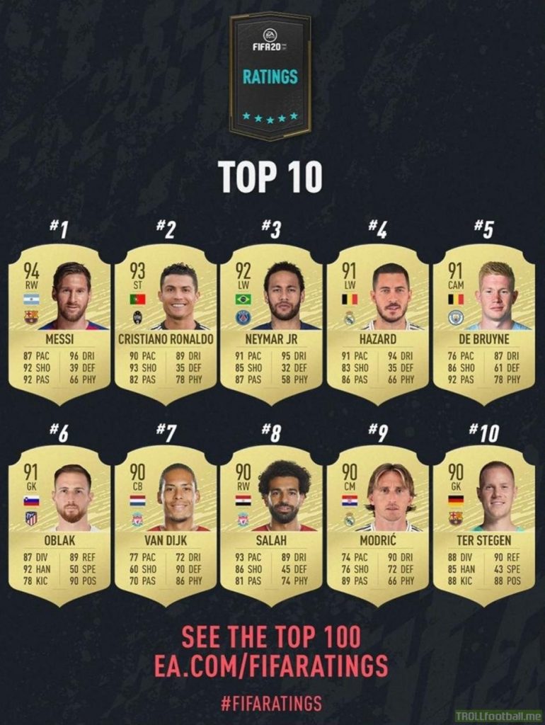 Tavaly Ronaldo és Messi is 94-es értékelést kapott, az azt megelőző két évben pedig csak a portugál volt 94-es. Most ez megváltozott, Messi kapta a 94 pontot, míg Cristiano Ronaldo csak 93-at. A harmadik idén is Neymar, a negyedik helyen hárman állnak: Hazard, De Bruyne és Oblak is 91-es értékelést kapott az EA Sportstól.
