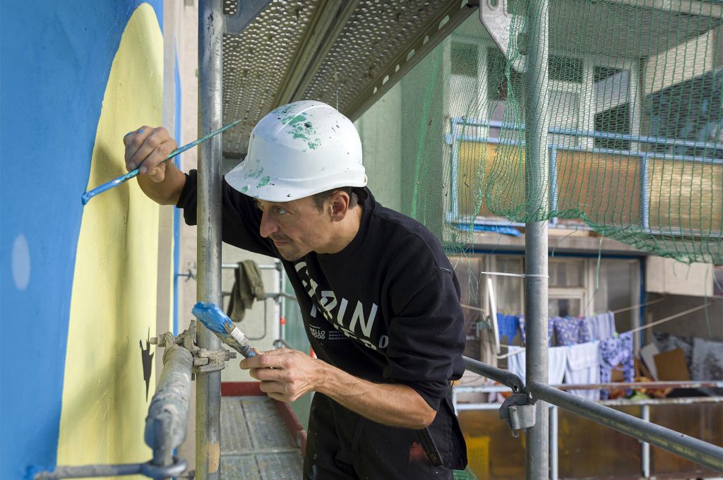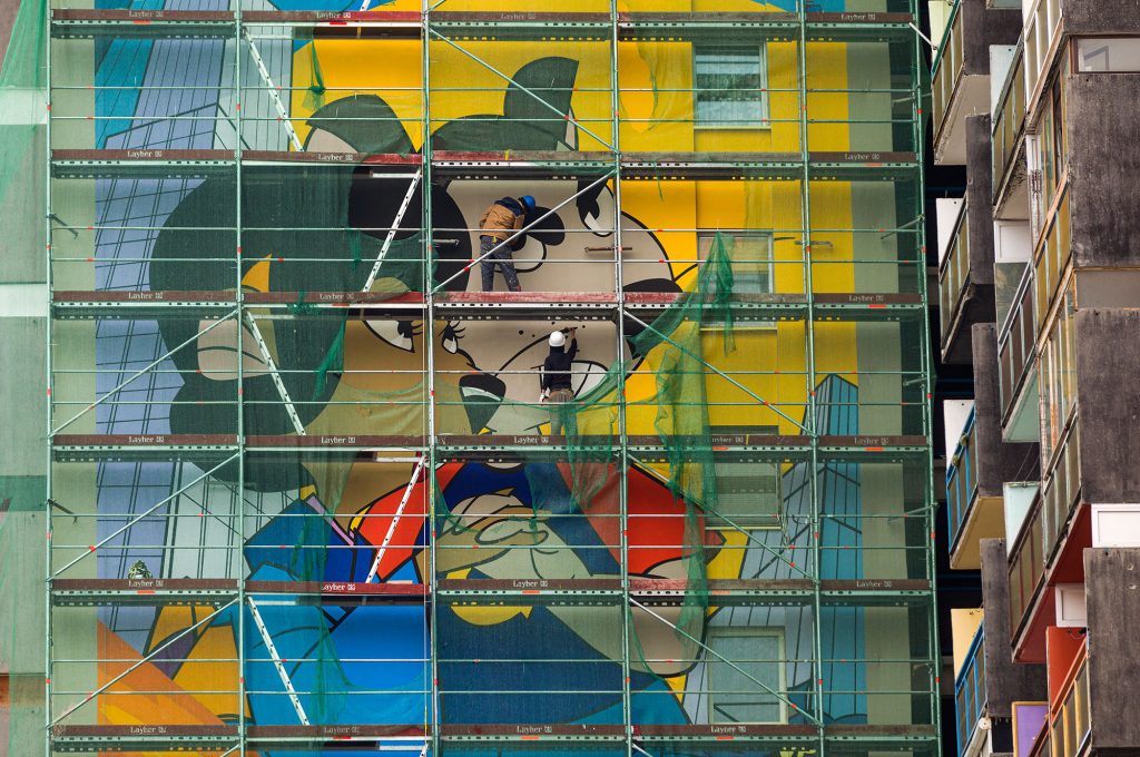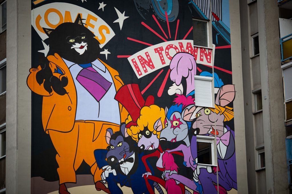 A Színes Város Csoport művészei ugyanis Józsefváros Önkormányzata támogatásával felfestettek egy látványos grafikát a Szigony utca egyik panelházának oldalára, mely a Macskafogó eredeti plakátja alapján készült. A két hónapig tartó munkálatok során 400 liter festéket használtak fel.