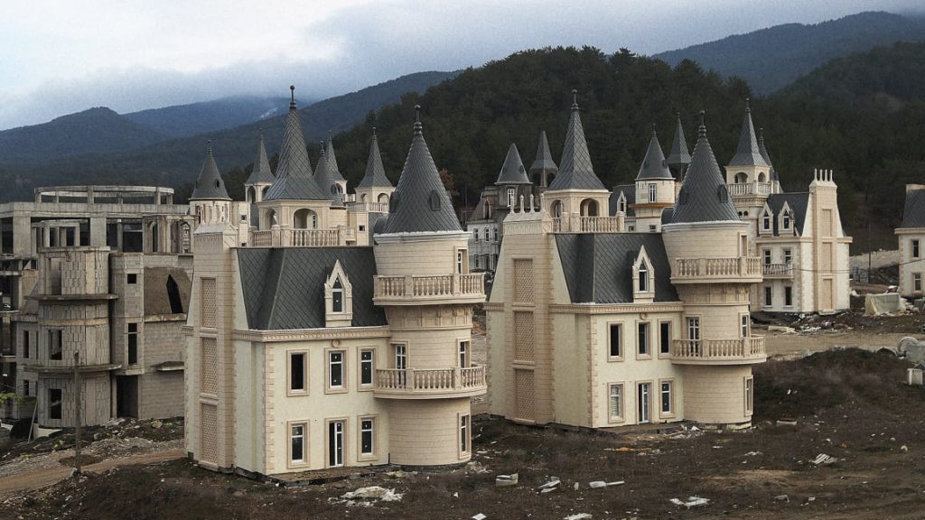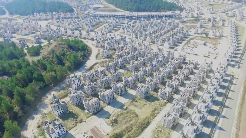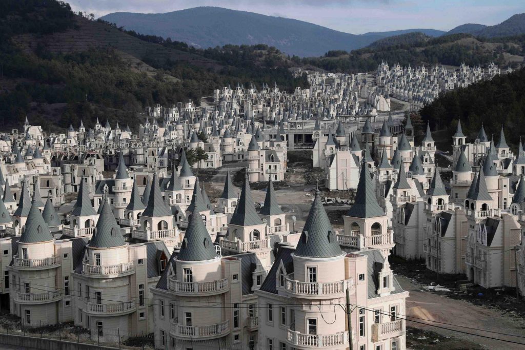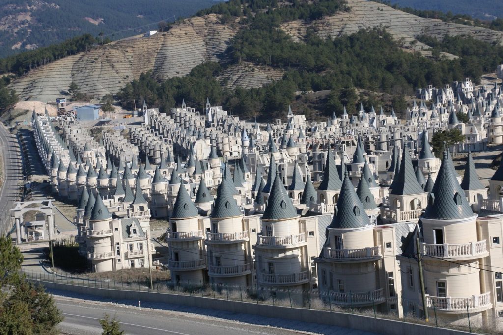 A bizarr lakóparkban nem rég még 85 millió és 140 millió forint közötti összegekért kínáltak mesebeli kastélyokat a tehetős törököknek, de az utóbbi években a kedvezőtlen nemzetközi visszhanggal járó belpolitikai események hatására az infláció elszabadult, a lakásvásárlási hajlandóság csökkent, ami azt eredményezte, hogy az anno még ilyen képekkel hirdetett park...