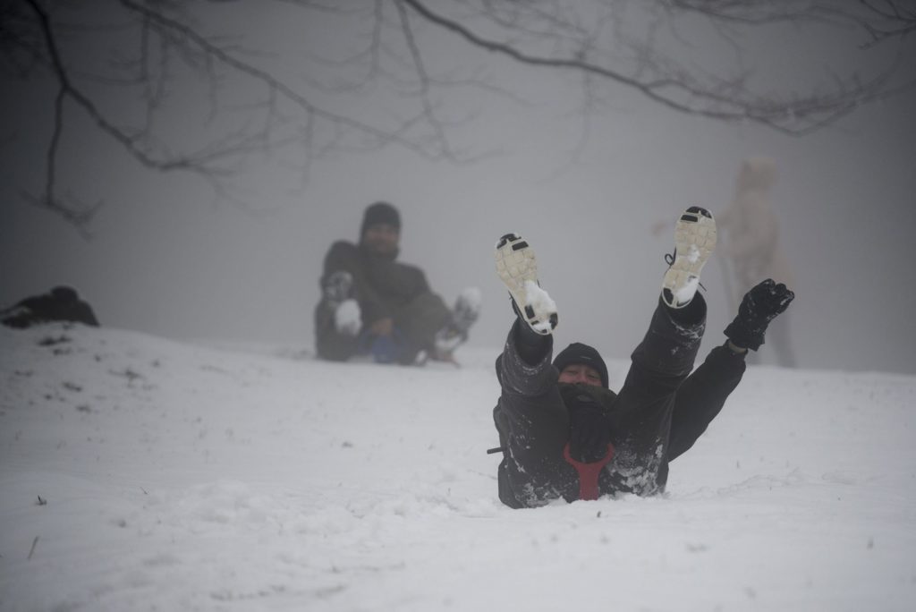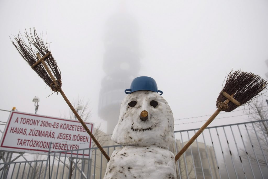 Április 18., Kékestető, Magyarország: sapka, sál, szánkó, hóember.