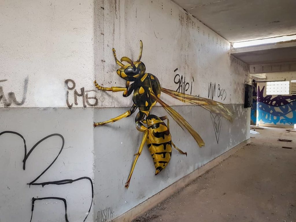 A portugál street-artos Odeith fújta falra ezeket a főleg méretük miatt szörnyű állatokat – a műveletet komoly tervezés előzte meg, hiszen a térbeli hatáshoz pontosan ki kell számítani, hogy adott nézőpontból pontos legyen az ábra. Sikerült – a fotók pedig pontosan ezekből a nézőpontokból készültek.