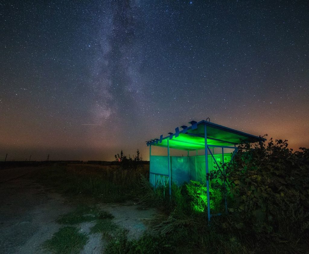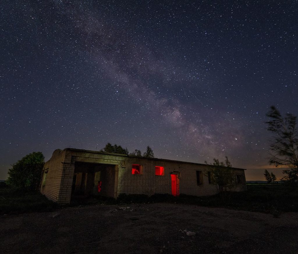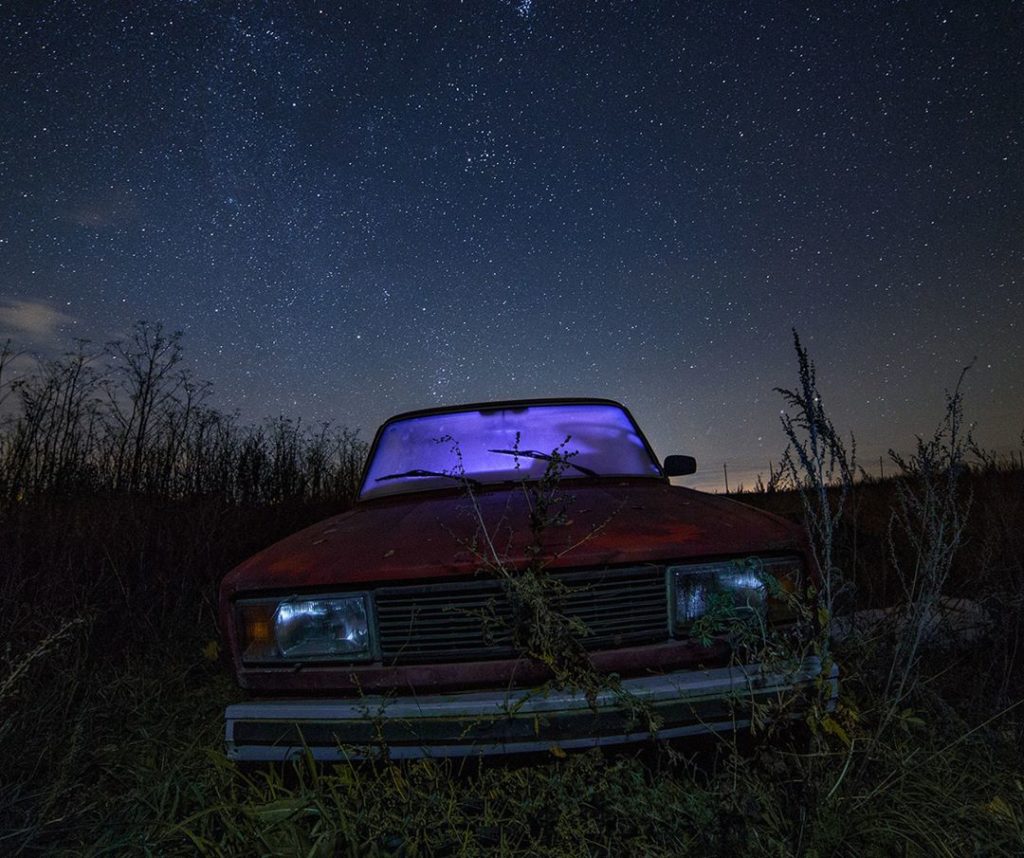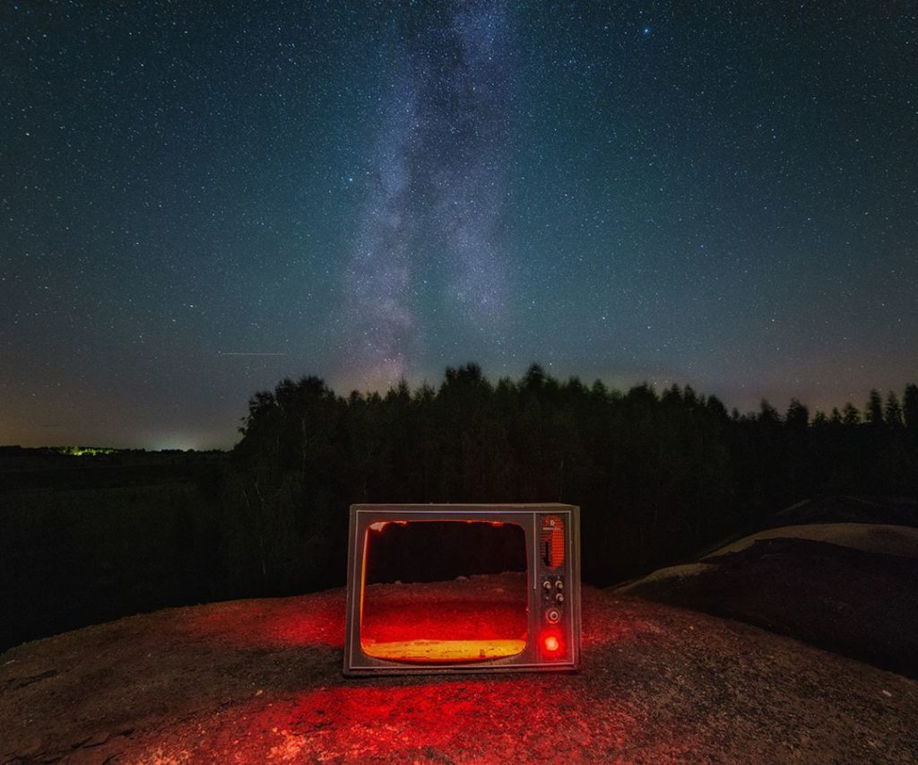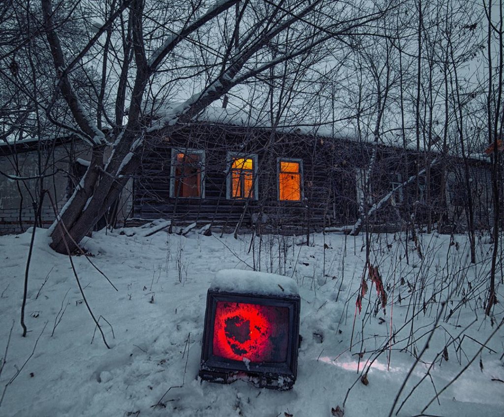 Színes fénycsíkok, vörösben izzó, törött tévé, játszadozás az ismeretlennel, valahol a semmi közepén, elhagyatott orosz szuburbánus környezetben.