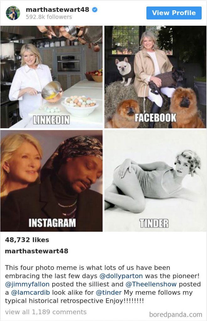 Dolly Parton a posztjához ír szövegben azt tanácsolja a férfi ismerőseinek, hogy olyan nőt szerezzenek maguknak, aki mind a négyre képesek – bár magyarázatot nem csatolt a kissé homályos üzenethez, de feltehetőleg arra gondolt (a négy fotót értelmezve), hogy az lehet az álomnő, aki helytáll a munkájában, akinek fontos az otthon melege, aki képes laza maradni és élvezni az életet, na és végül csibész tud lenni a hálószobában. Nos, hamarosan megannyi híresség feltöltötte a maga kis kollázsát a netre, és persze a jópofa mémek, és sorozatkarakterekre optimalizált változatok is megjelentek közöttük. Ezekből közölnénk most egy válogatást: