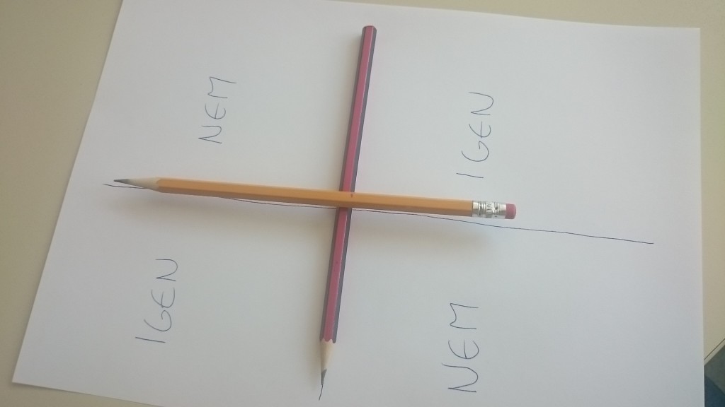 Nincs más dolgod, mint egy papírt négy területre osztani egy vízszintes, majd egy merőleges vonallal, az egymással szemben lévő részekre pedig felírni egy-egy igen-t és nem-et. Ezután a vonalakra rá kell helyezned két ceruzát, úgy, hogy a felső lehetőleg tökéletes egyensúlyban legyen, majd jöhet a hiszékenyebb haverok nagyipari befosatása. Valahogy így, de azért te légy inkább igényes és használj vonalzót!