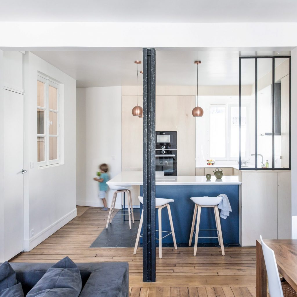Anne-Laure Dubois párizsi tervező tette meg konyhapultja alapjának a klasszikus kéket, ami nagyon jól illik a szép fa hajópadlóhoz és a minimalista enteriőrhöz.