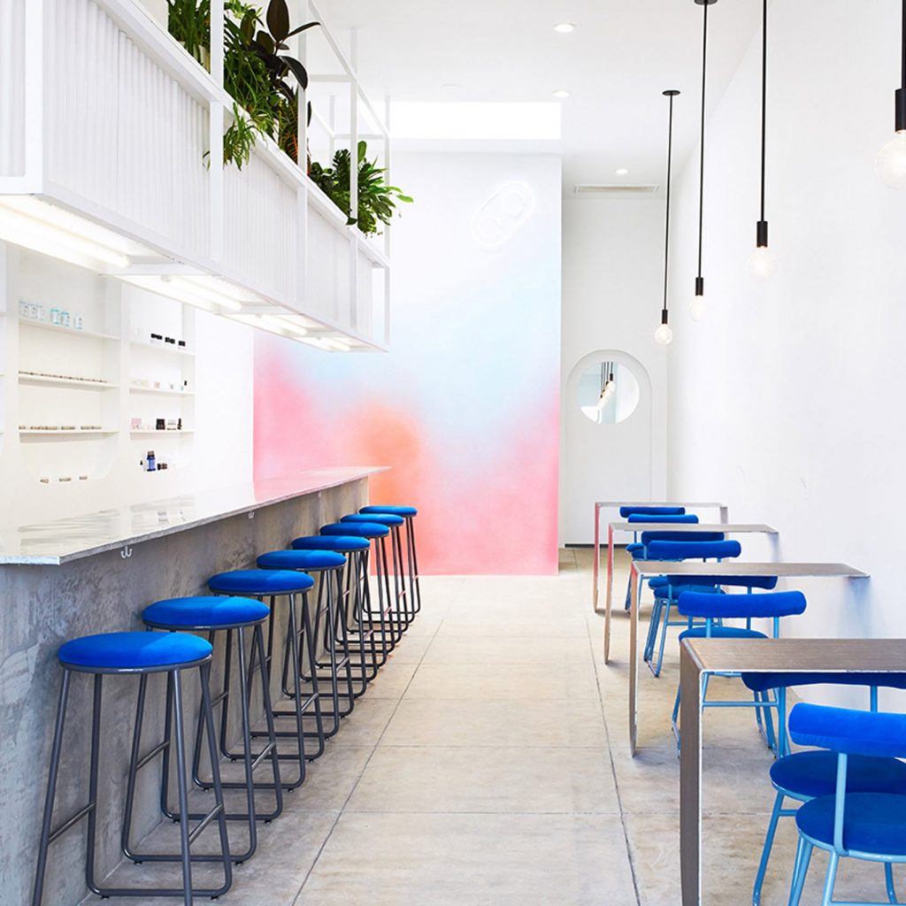 Egy kozmetikai szalonban kaptak a bárszékek vibrálóan kék ülőpárnát a Los Angeles-i Color Campben, melyet az amerikai J Byron-H építész jegyez tervezőként.