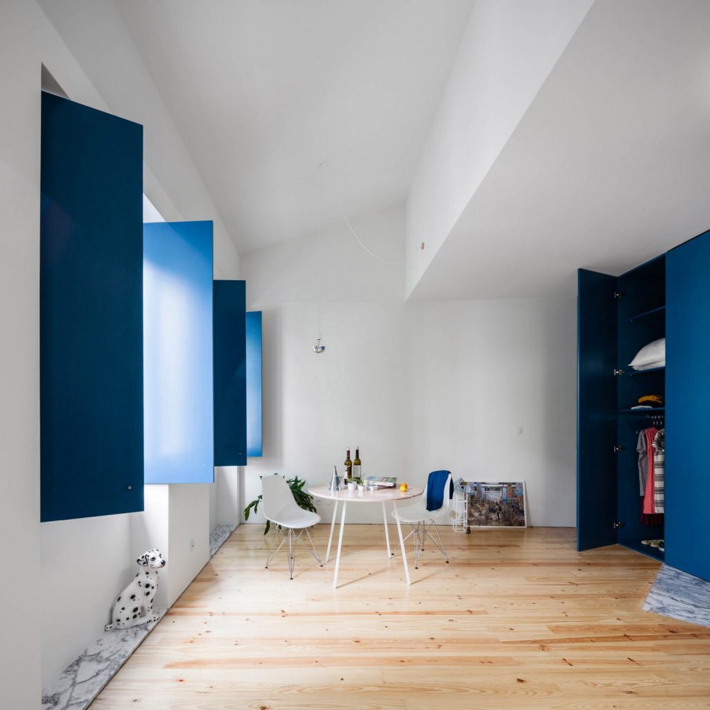 A Fala Atelier stúdió a beltéri spalettákat festette kékre ebben a portói lakásban – de a szekrényajtón is megjelenik a domináns kék.
