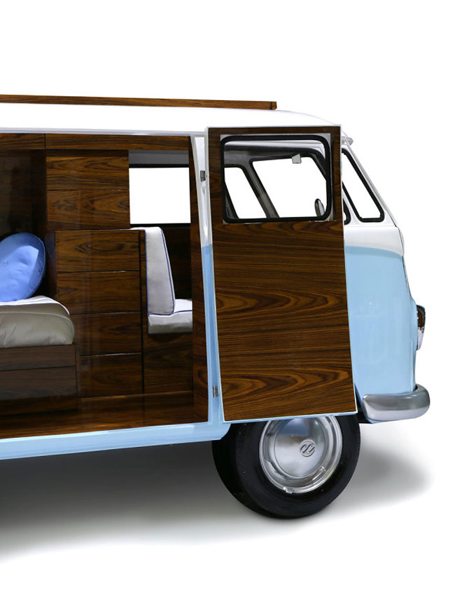 A másik bútor egy kész kis lakosztály a maga nemében, és az ikonikus VW Type2 inspirálta. A csalás csak annyi, hogy itt nem egy eredeti járgányt építettek be, hanem az csak az alapot és az ötletet adta. Mindenesetre visszagondolva nem éppen sanyarú gyerekkorunkra, egy ilyen lakosztályt azért elfogadtunk volna szó nélkül, bármikor.