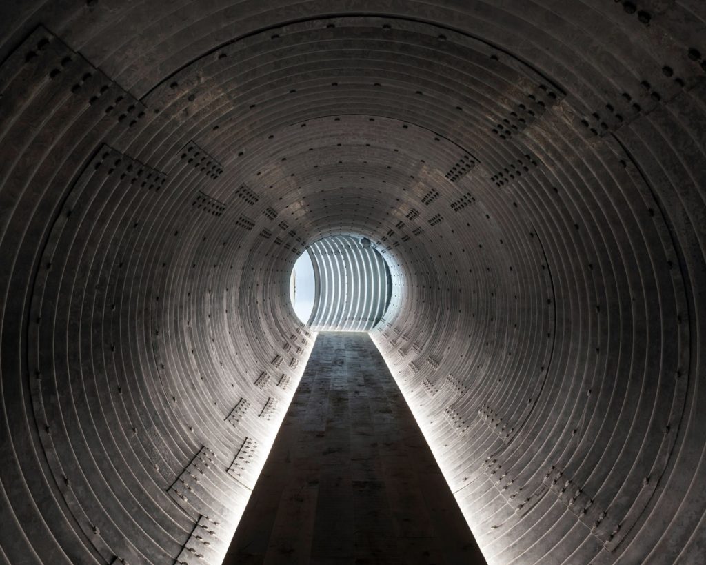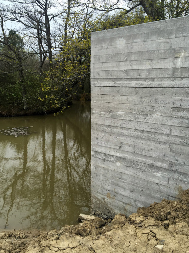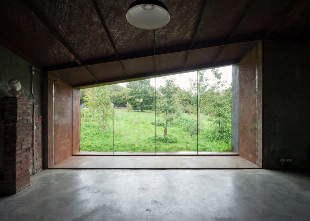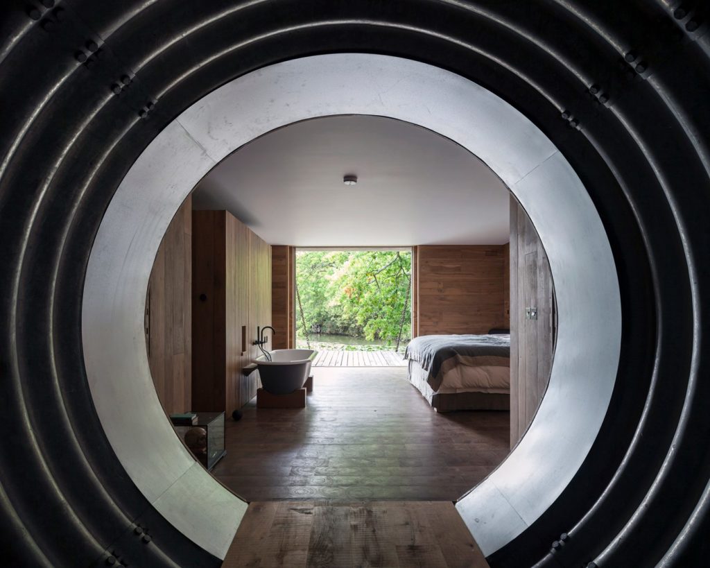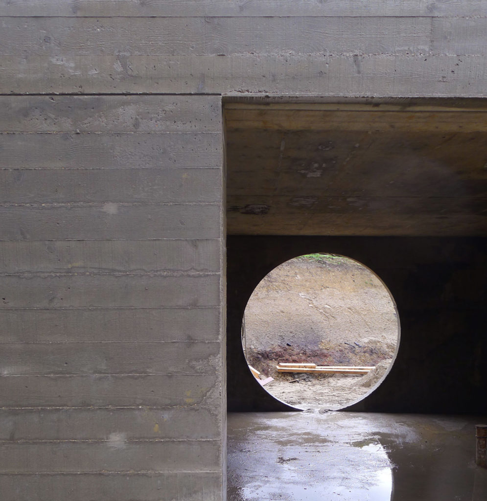Egy művész stúdiójának és egy hozzá tartozó vendégház építésével bízták meg a Carmody Groarke stúdiót, akik egészen rendhagyó módját választották a két ház összekötésének: egy batár indusztriális betonalagút mellett döntöttek, méghozzá a föld alatt. A Két pavilon névre keresztelt projekt egy mesterséges tó mellett/alatt áll és hát ha nem lenne konceptuális, akkor megkockáztatnánk a lepukkant szót rá kívülről – de belülről már nagyon látszik, hogy megtervezett trasht látunk.
