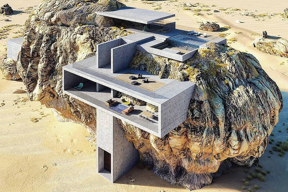 A szürrealizmust egy újabb szintre emelte, ugyanis tervezett egy házat egy hatalmas szikla belsejébe. Frank Lloyd Wright, a természetközeli, organikus építészet atyja bizonyára büszke lenne indiai kollégájára. A különleges lakhely egyébként Szaúd-Arábiában található Madáin Szálih közelében, és úgy ötven éve egy átlagpolgár még joggal hihette volna a földönkívüliek egyik titkos földi bázisának.