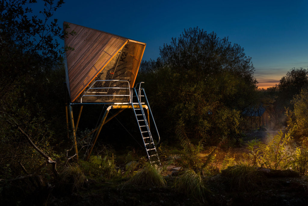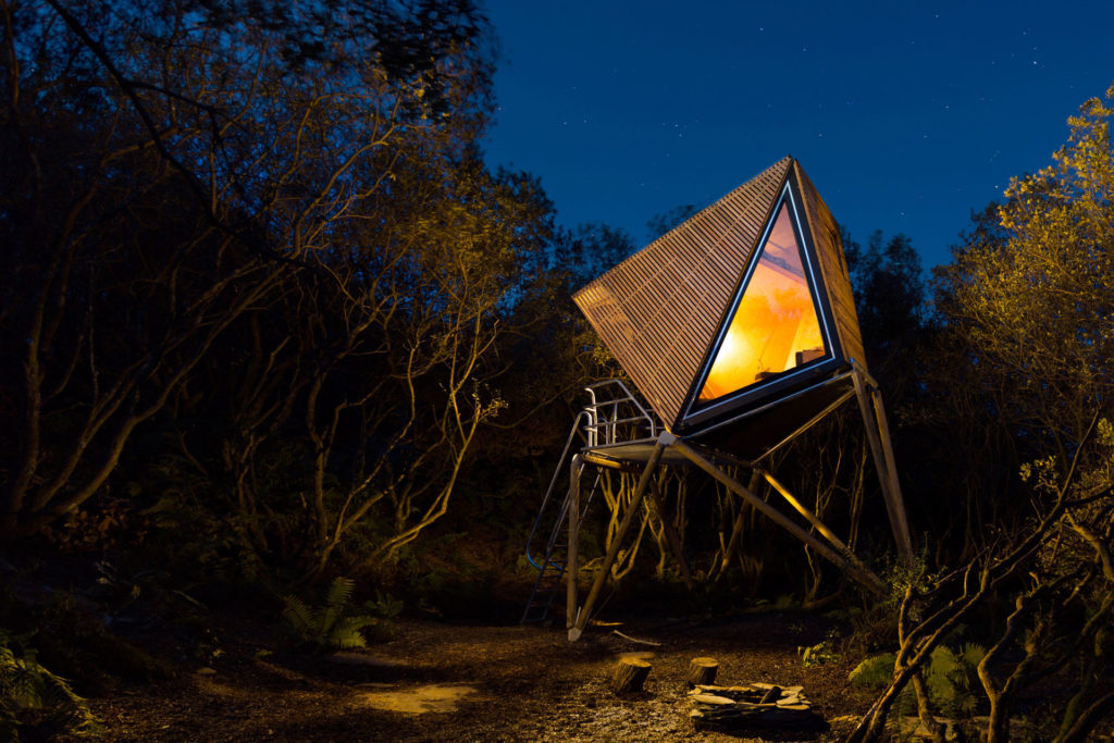 Ugyanis különleges kabinokat szereltek fel az egyik erdőben, a szögletes, vörösfenyővel díszített építmények a fenyőfák felett helyezkednek el, és gyönyörű kilátást biztosítanak a tájra. A létrán keresztül egy panelburkolatú belső térbe léphetünk be, amelyben ülősarok és hálósarok is van, a környező táj pedig gyönyörűen kivehető a háromszögablakokon keresztül. Nem rossz. Meteorraj-figyelésre mondjuk éppenséggel tökéletes.